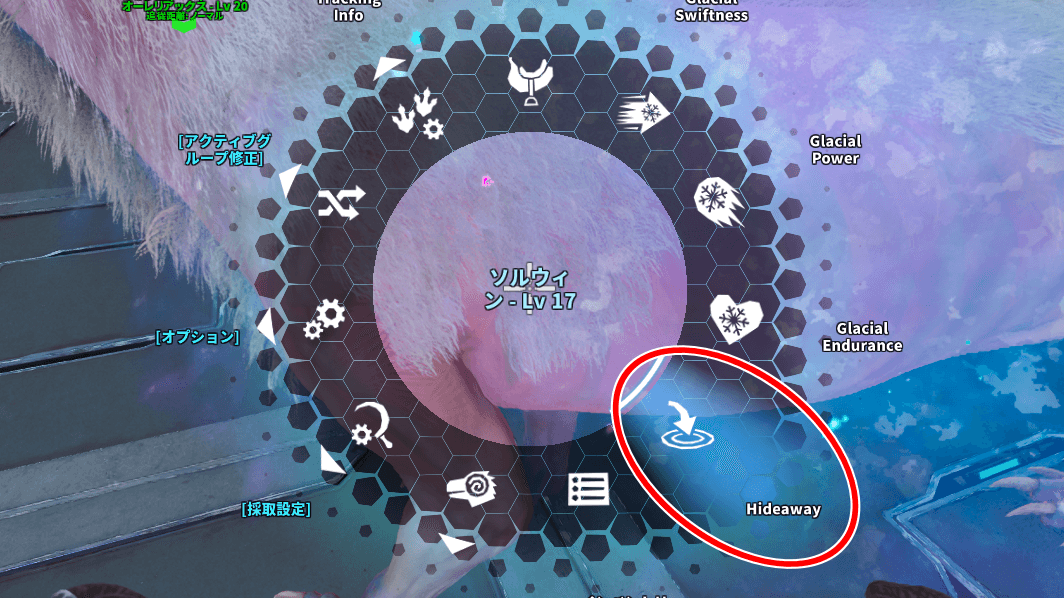 ソルウィンから降りた状態のサークルメニューで「Hideaway」を選ぶと、ソルウィンをインベントリに収納可能だ。限定の低温ポッドのようなアイテムの状態になり、アイテムを使うとサバイバーの前方に再出現する。ポッドと同様に30日の期限がある点には注意で、低温冷蔵庫で充電が可能。