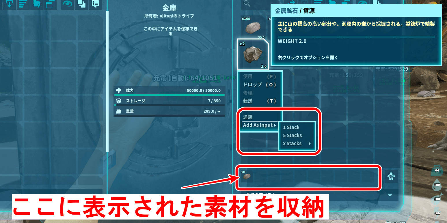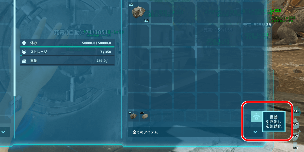 | 2 | 格納したいストレージに格納したいアイテムを入れる。 |