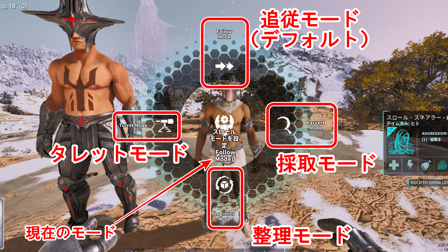追従モードはデフォルトの状態で、追従指示をするとサバイバーに追従。追従モードにしただけではついてこず、その場で待機や中立指示で敵対生物に反撃するなど、ペット同様の挙動になる。