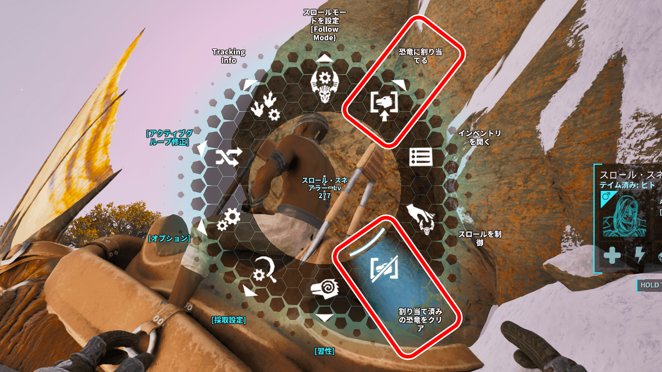 スロールのモードを指定すると、モードに応じて仕事を任せられる。採取や整理は指定すれば勝手にしてくれるため、ソロプレイ時のファームやアイテム整理に活用しよう。