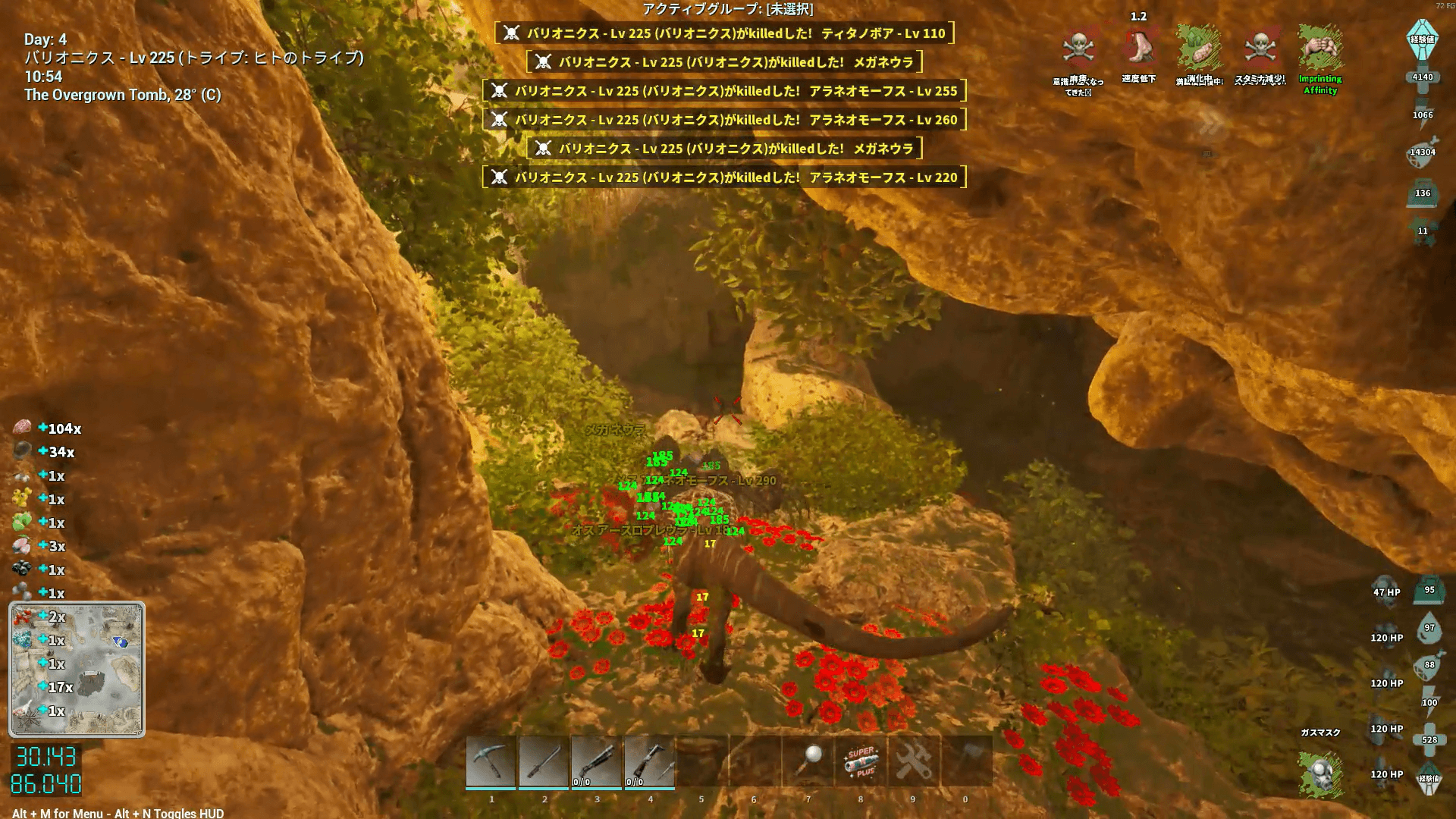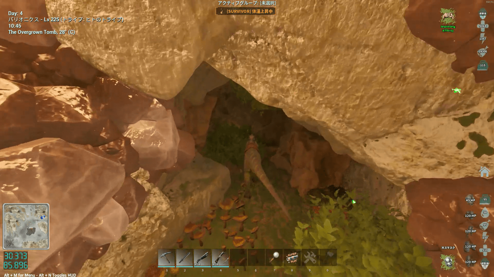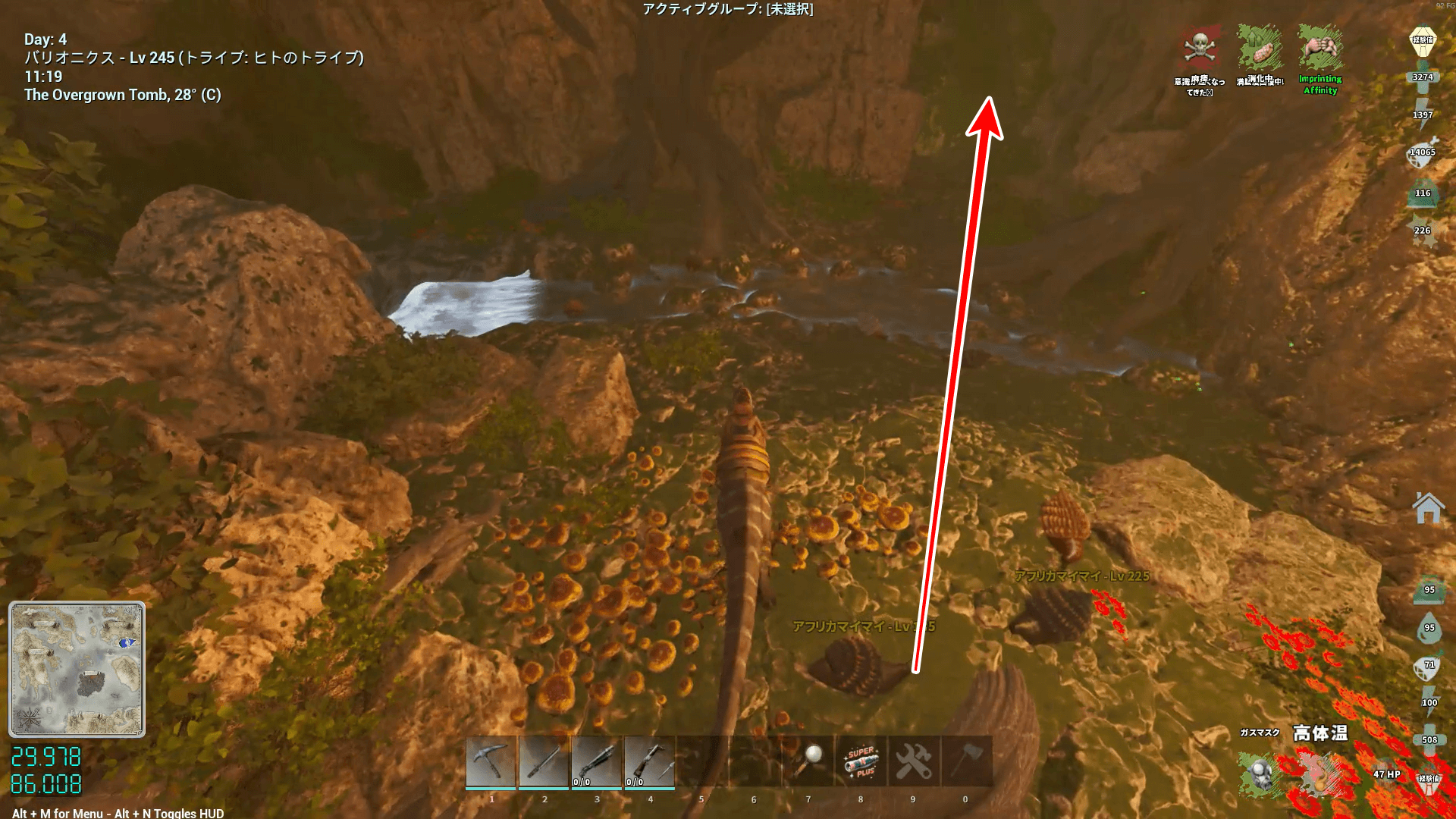 敵の構成もアイランドの免疫と似ており、上限突破した虫が大量に生息している。火力ももちろんだが、サドルや体力へのポイント割り振りで耐久力も高めておこう。刷り込み100%の騎乗者ボーナス込みなら、原始サドルでもHP1万程度あれば生還できる。