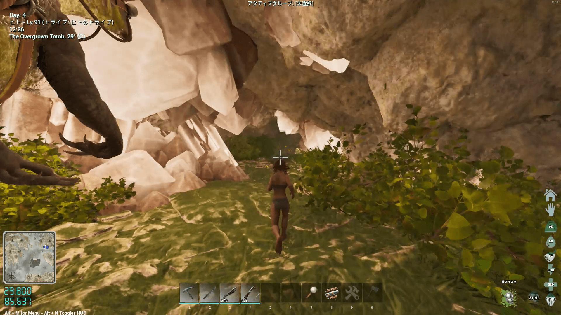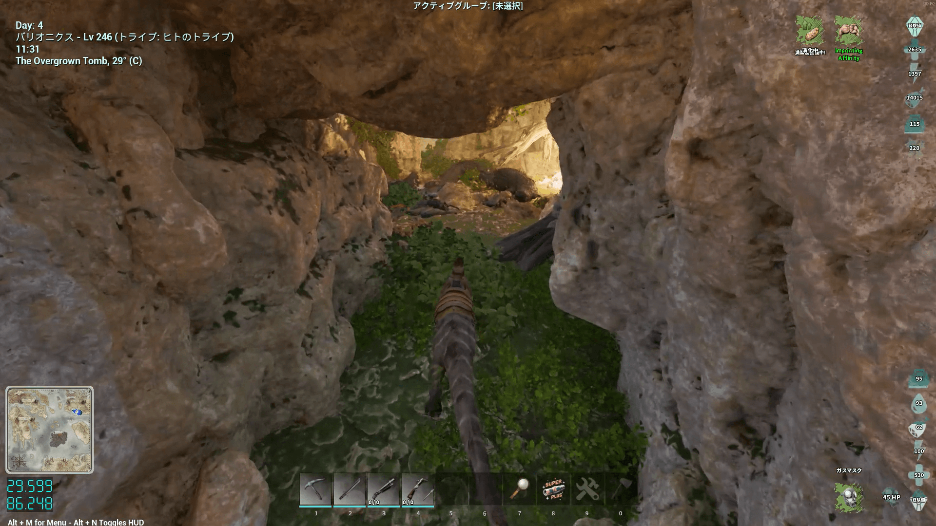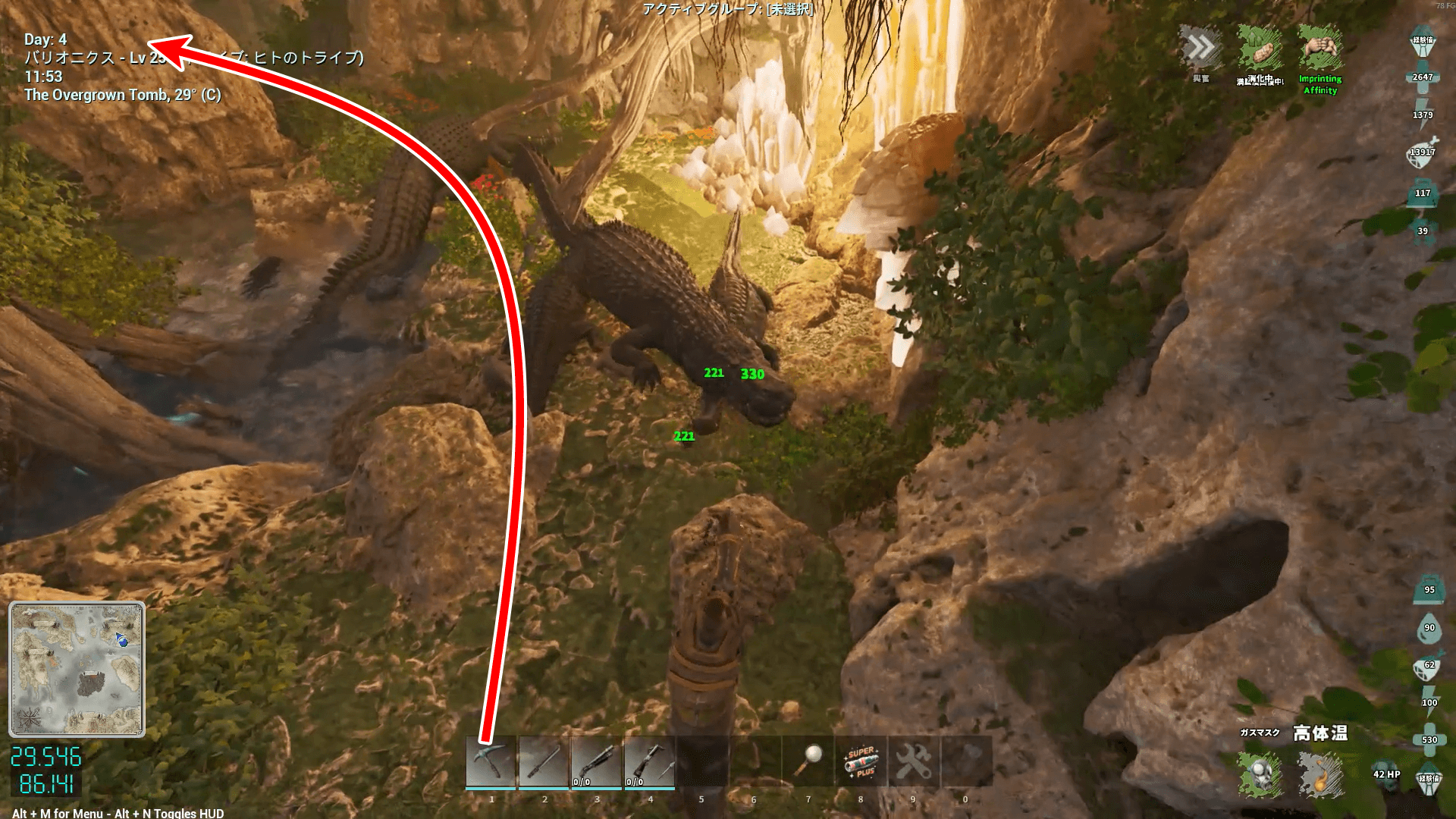 敵の構成もアイランドの免疫と似ており、上限突破した虫が大量に生息している。火力ももちろんだが、サドルや体力へのポイント割り振りで耐久力も高めておこう。刷り込み100%の騎乗者ボーナス込みなら、原始サドルでもHP1万程度あれば生還できる。