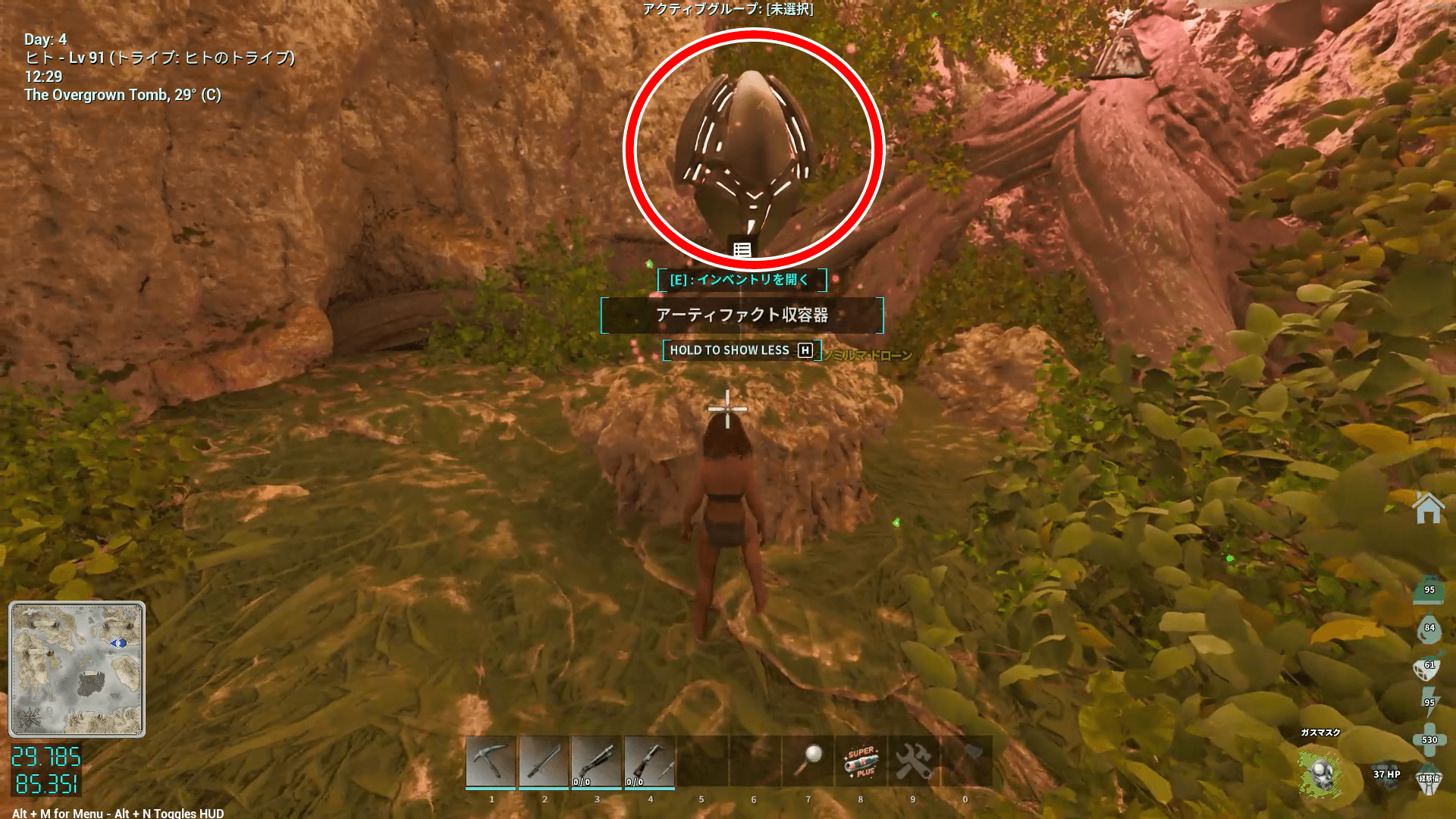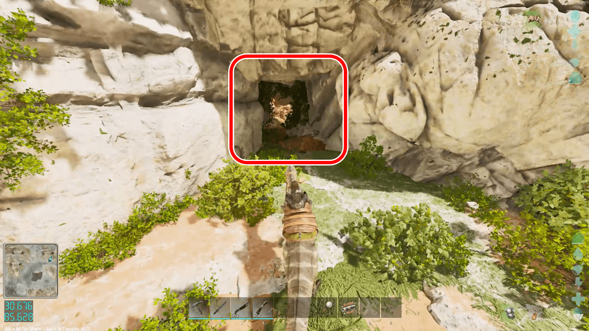 通路の奥は騎乗していると進めないため、ペットから降りて狭い穴の奥に進もう。奥のアーティファクト付近にティタノミルマがいる場合があり、防虫剤を使うか銃火器で対処するのがおすすめ。