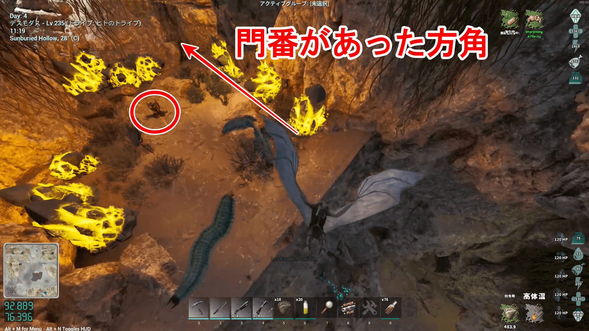 右下に進みすぐある地面付近の穴を通り抜ける。通り抜けた先は門番アーティファクトがある部屋だが、敵対生物が湧くため掃討しておく。