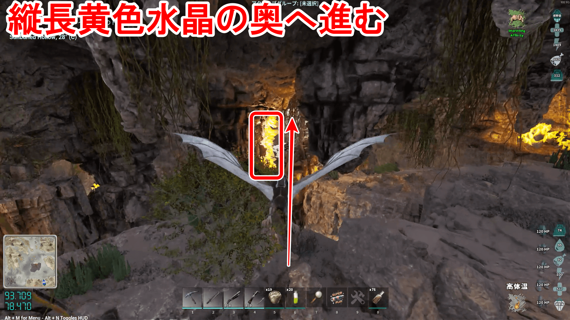 座標94.0/79.1付近にある洞窟の入口に向かう。半円に囲んでいる石の階段と赤い水晶が目印。