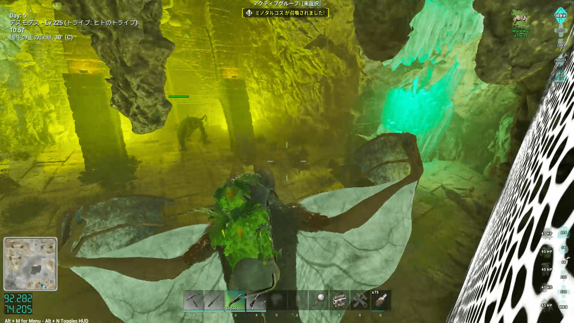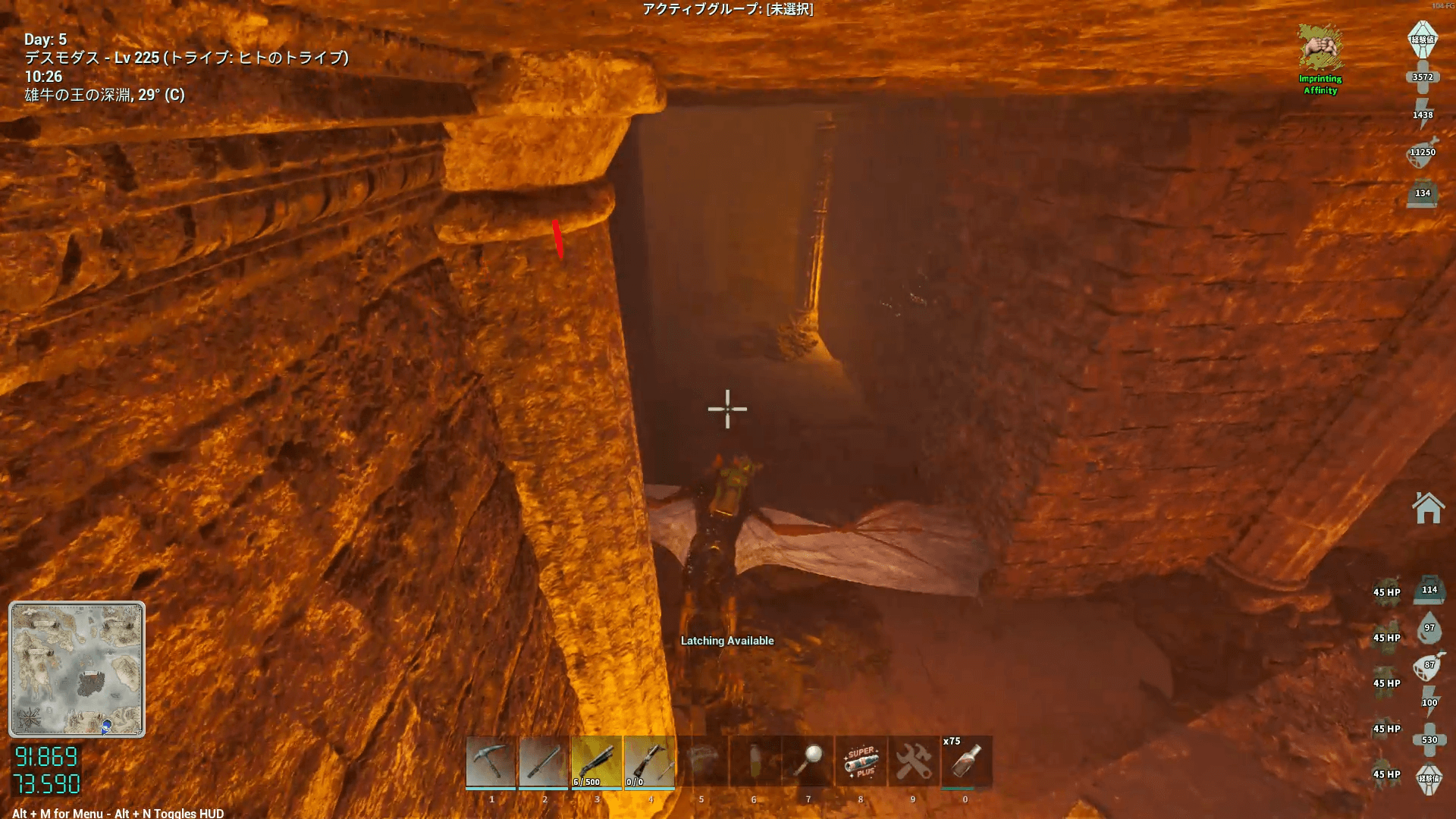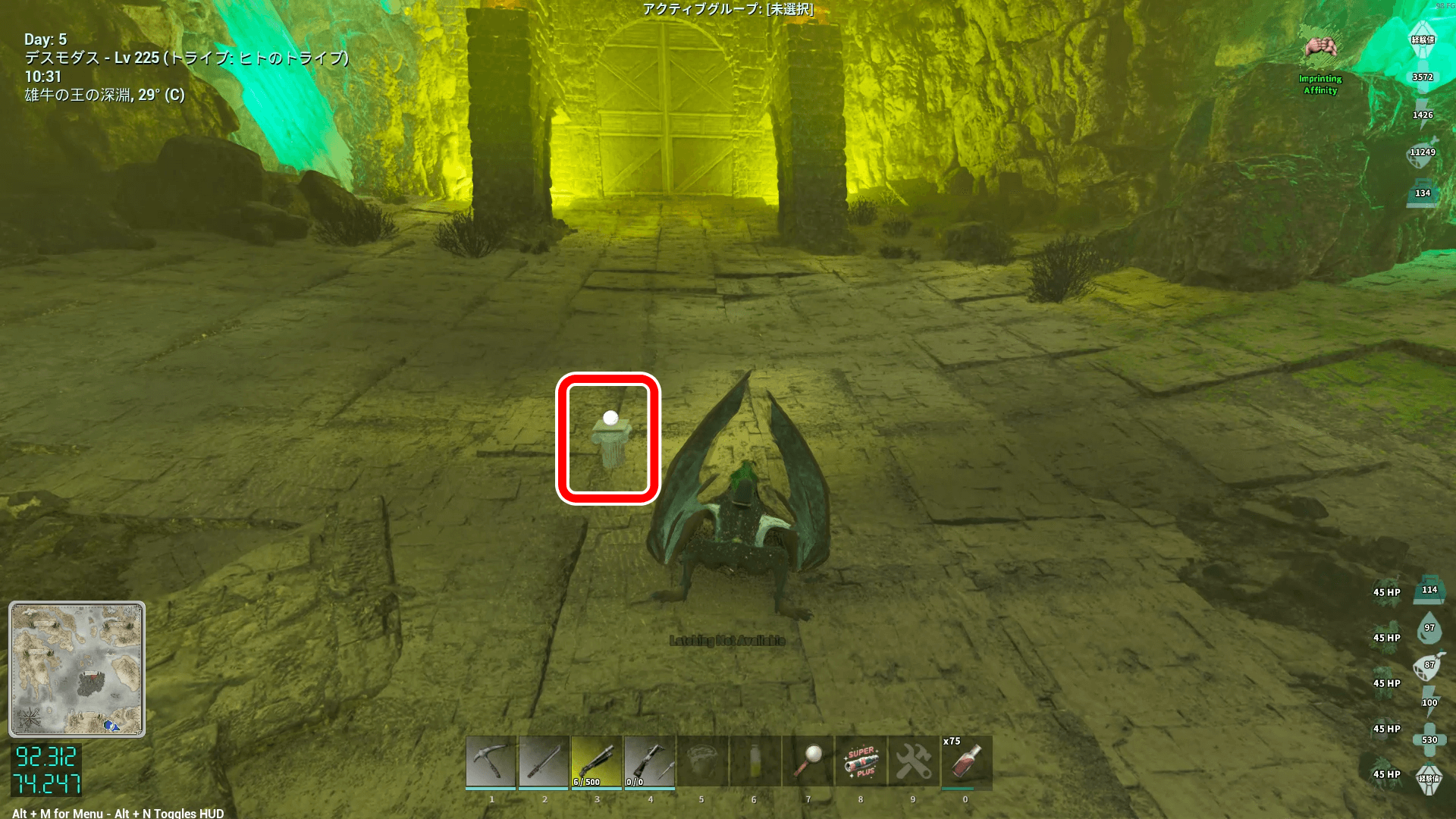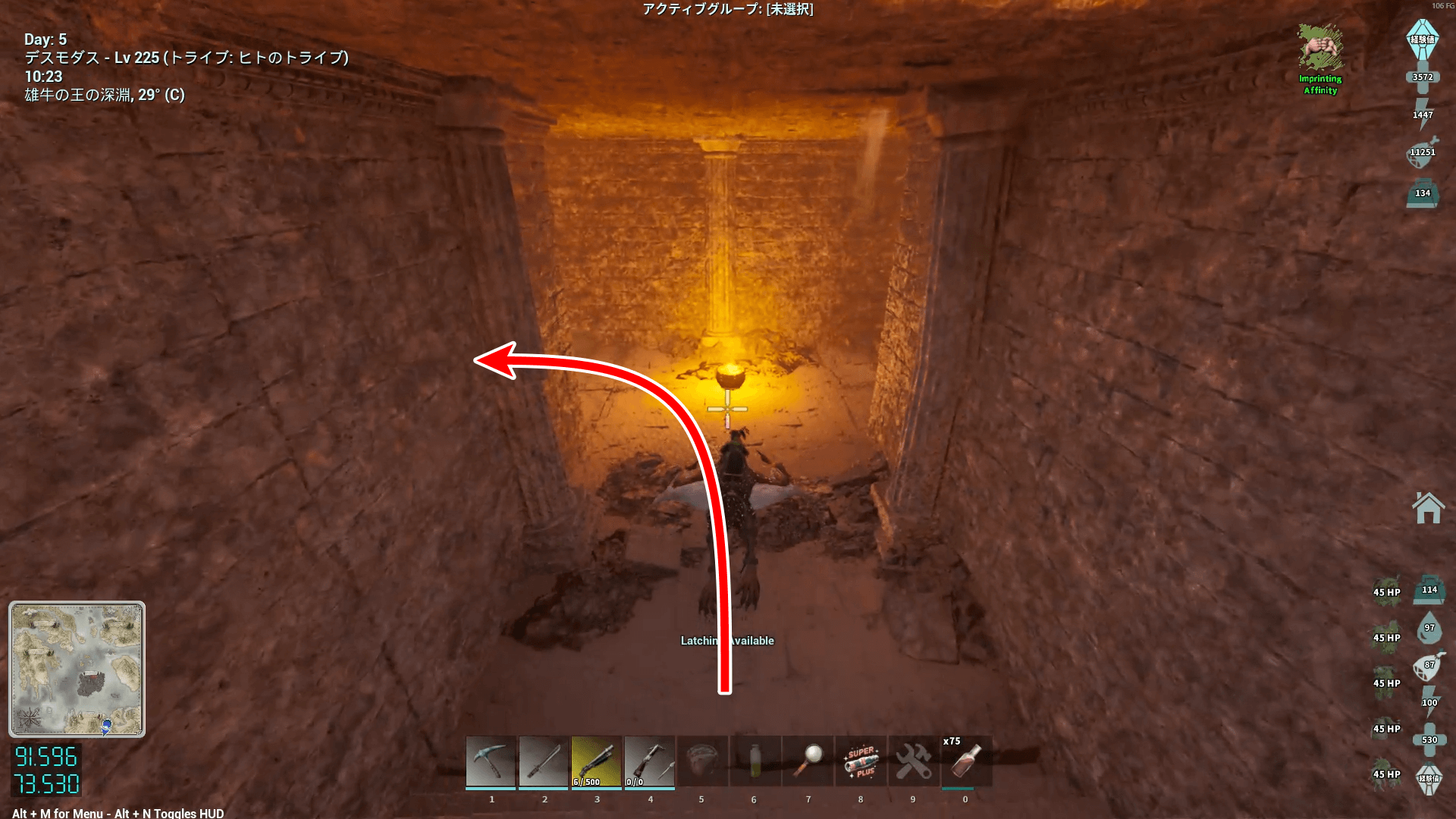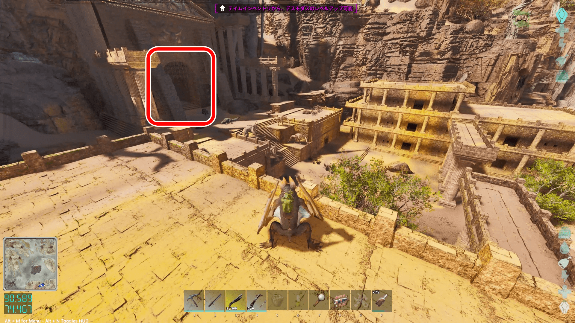座標91.1/74.0付近にある、神殿のような見た目の洞窟の入口に向かう。入口付近に敵対生物が多いため、なるべく避けて入ろう。