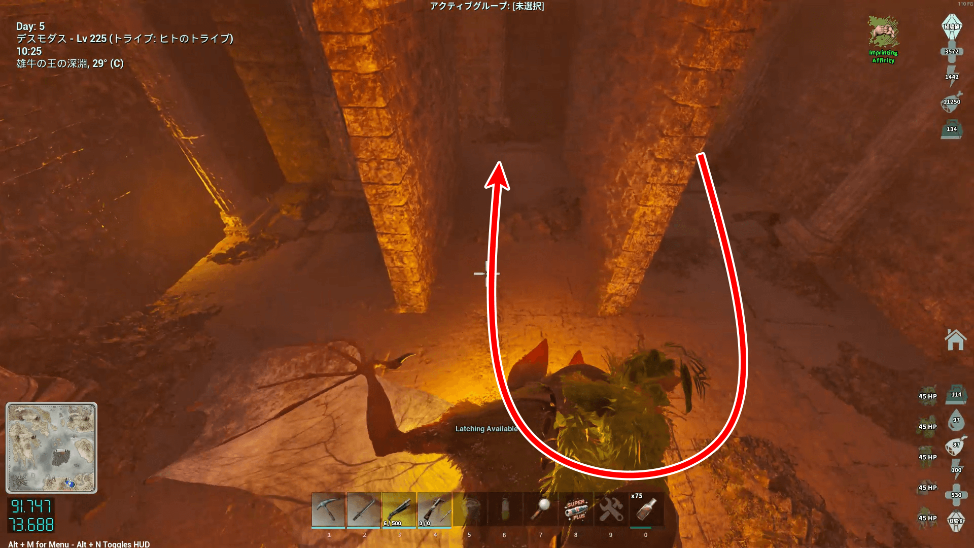 透明壁の天井付近まで移動したらポンショでボスを釣って、デスモダスの真下に来たボスへ攻撃し続けよう。デスモダスで見えない場合は、ボスのHPバーの少し下を狙うと当たりやすい。天井や透明壁には貼り付けないため、デスモダスのホバリングを維持しつつ戦おう。