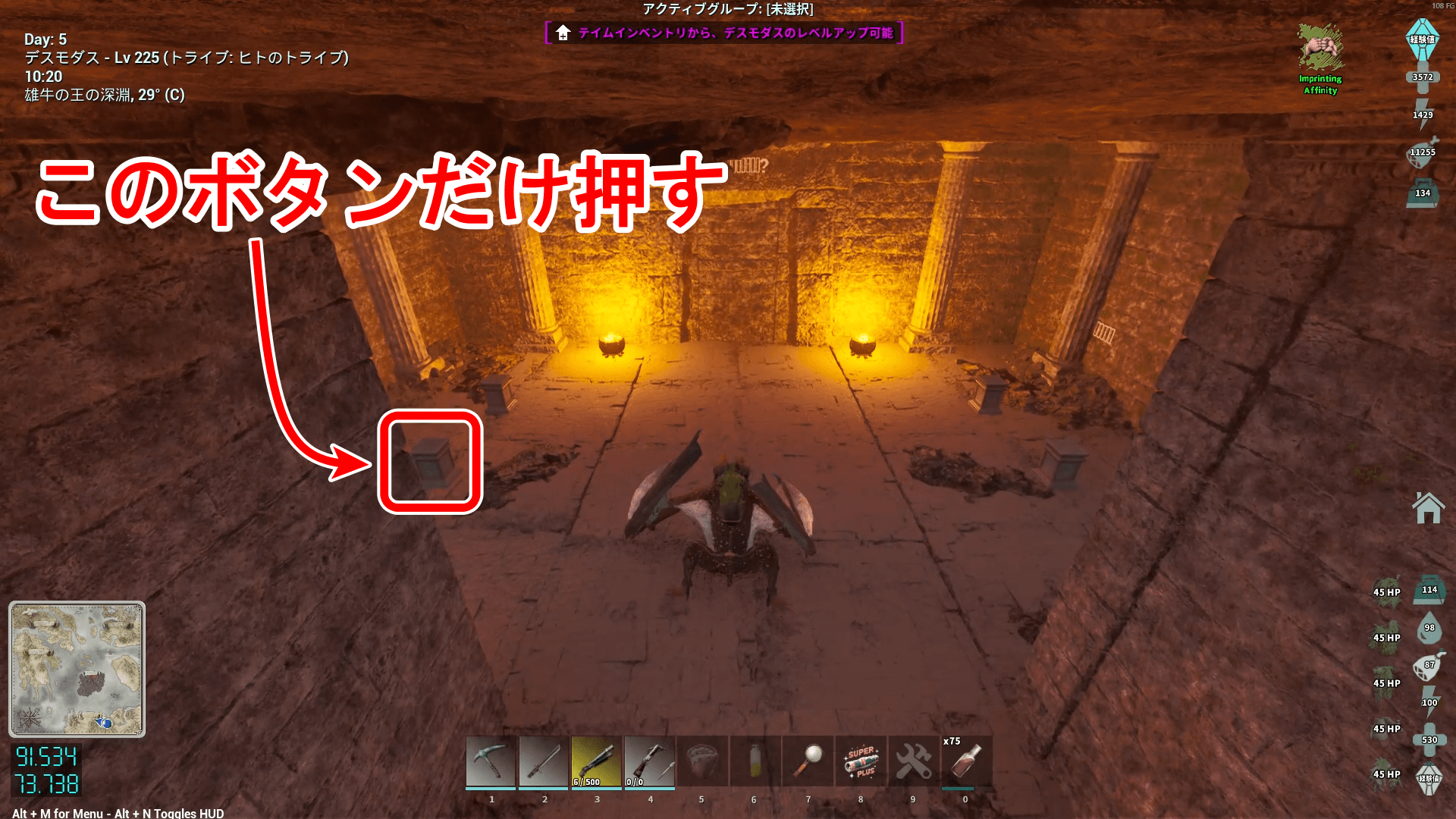 奥の足場の中央にあるターミナルへ貢物を入れ、ボスを召喚しよう。乗って来たデスモダスは、すぐ乗れるようにターミナルの付近で待たせるのがおすすめ。