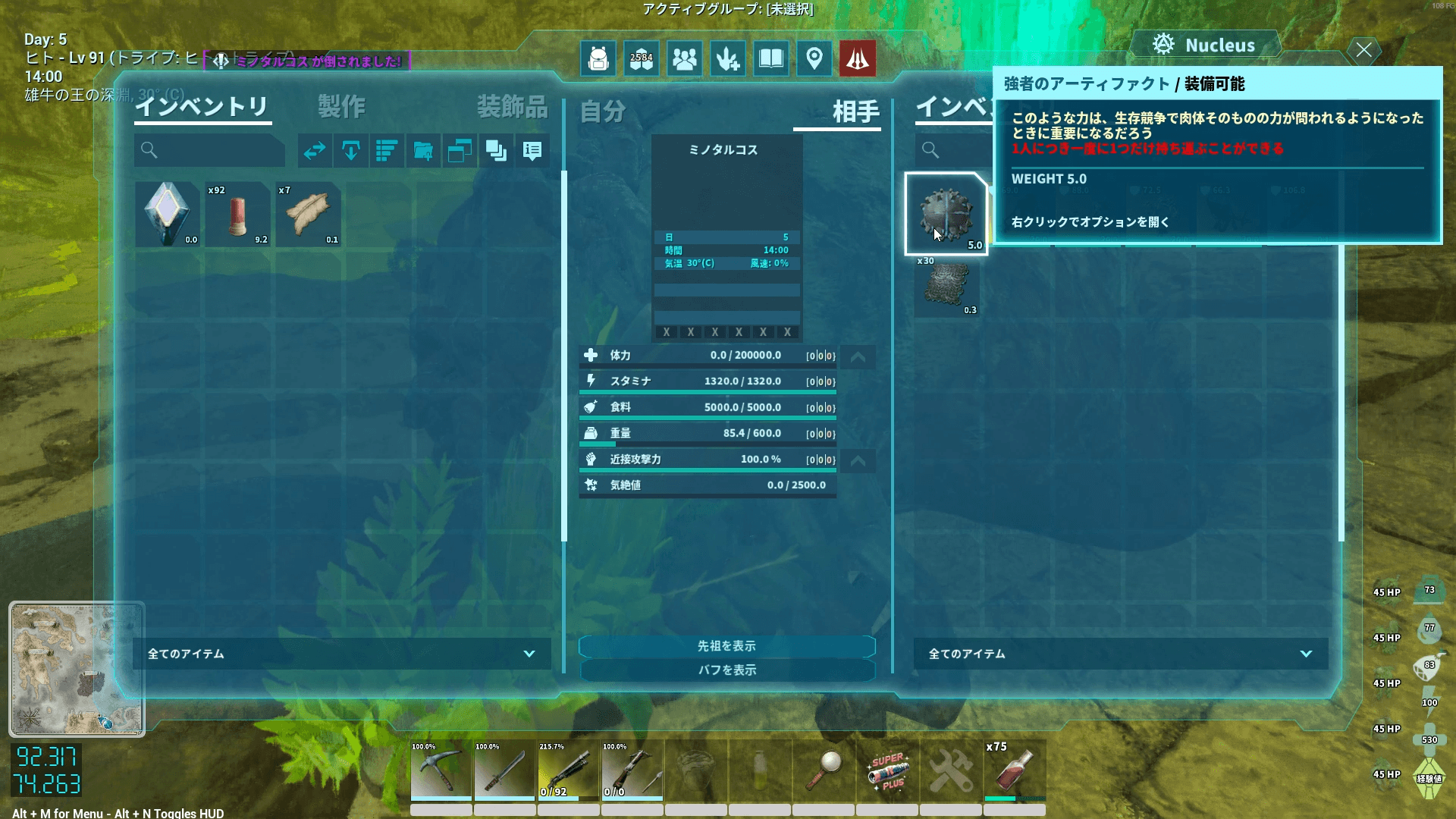 ボスを倒したら、ボスの体から強者のアーティファクトを回収しよう。アーティファクトのほかに、サドルやエレメント30個も手に入る。