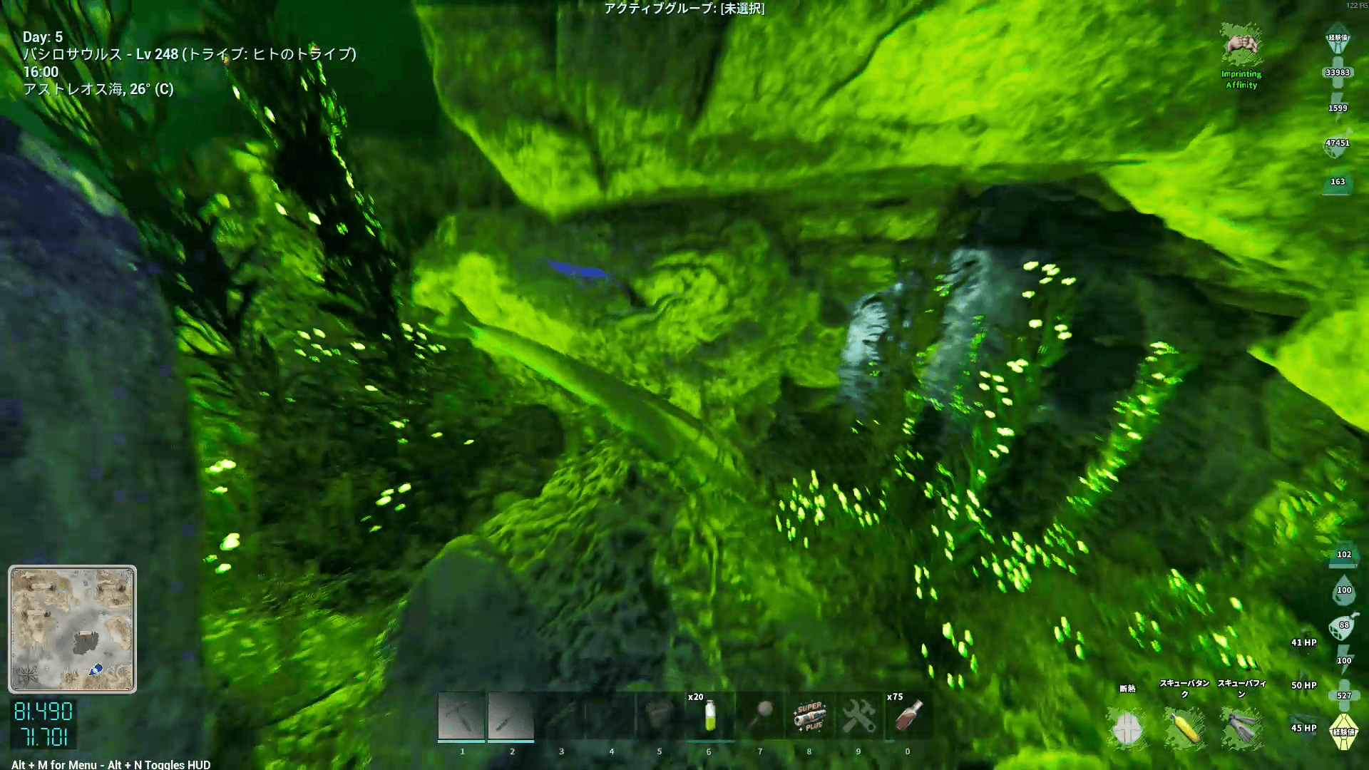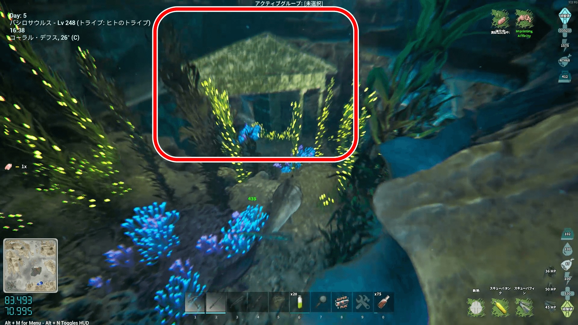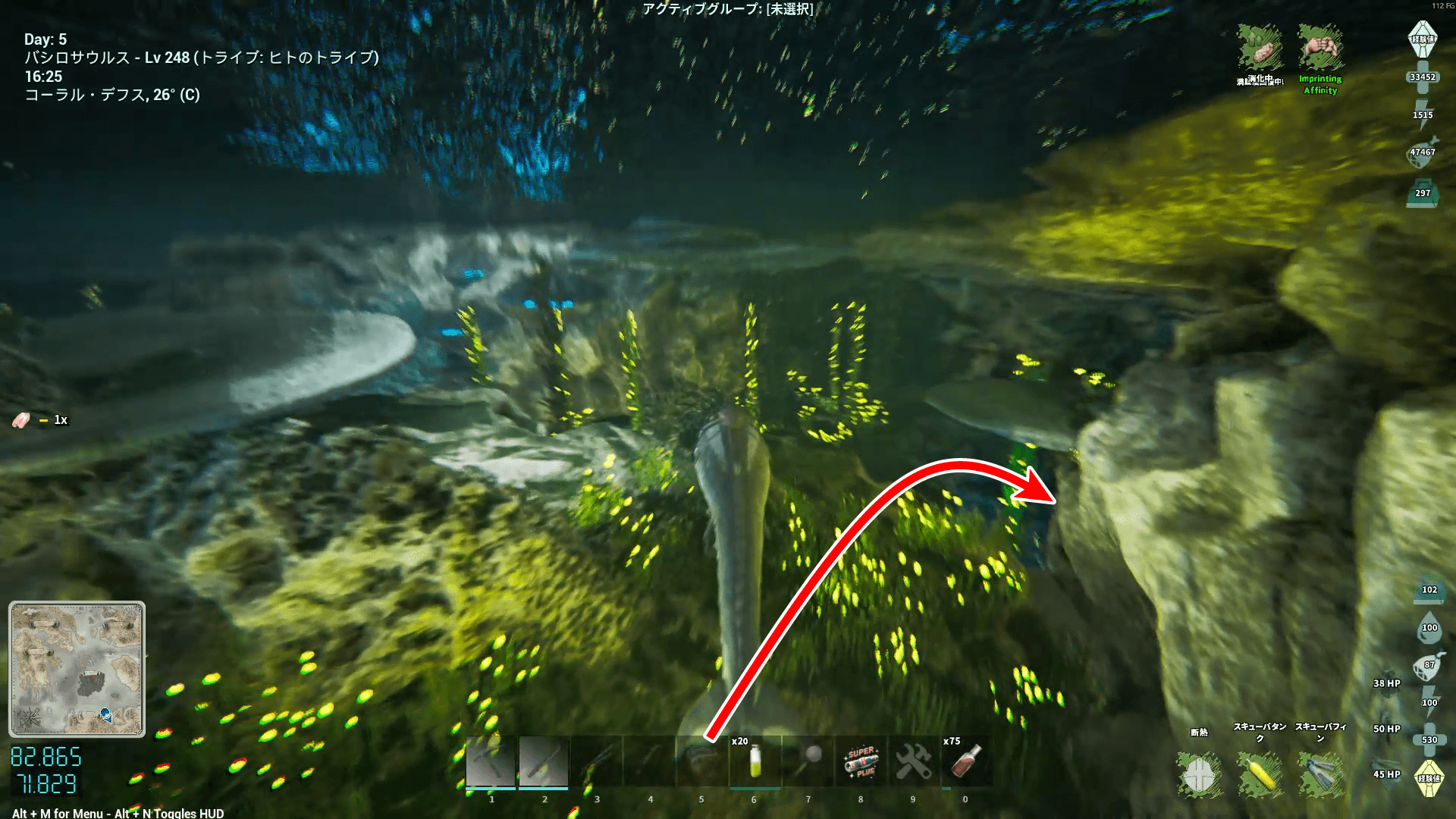 座標80.9/72.0付近にある海底の洞窟の入口に向かう。バシロは進入可能だが、モササウルスなどは進入不可。