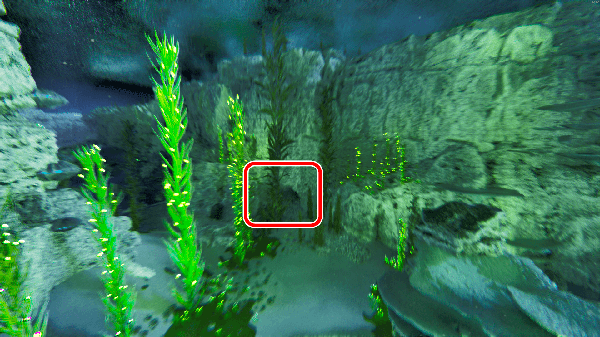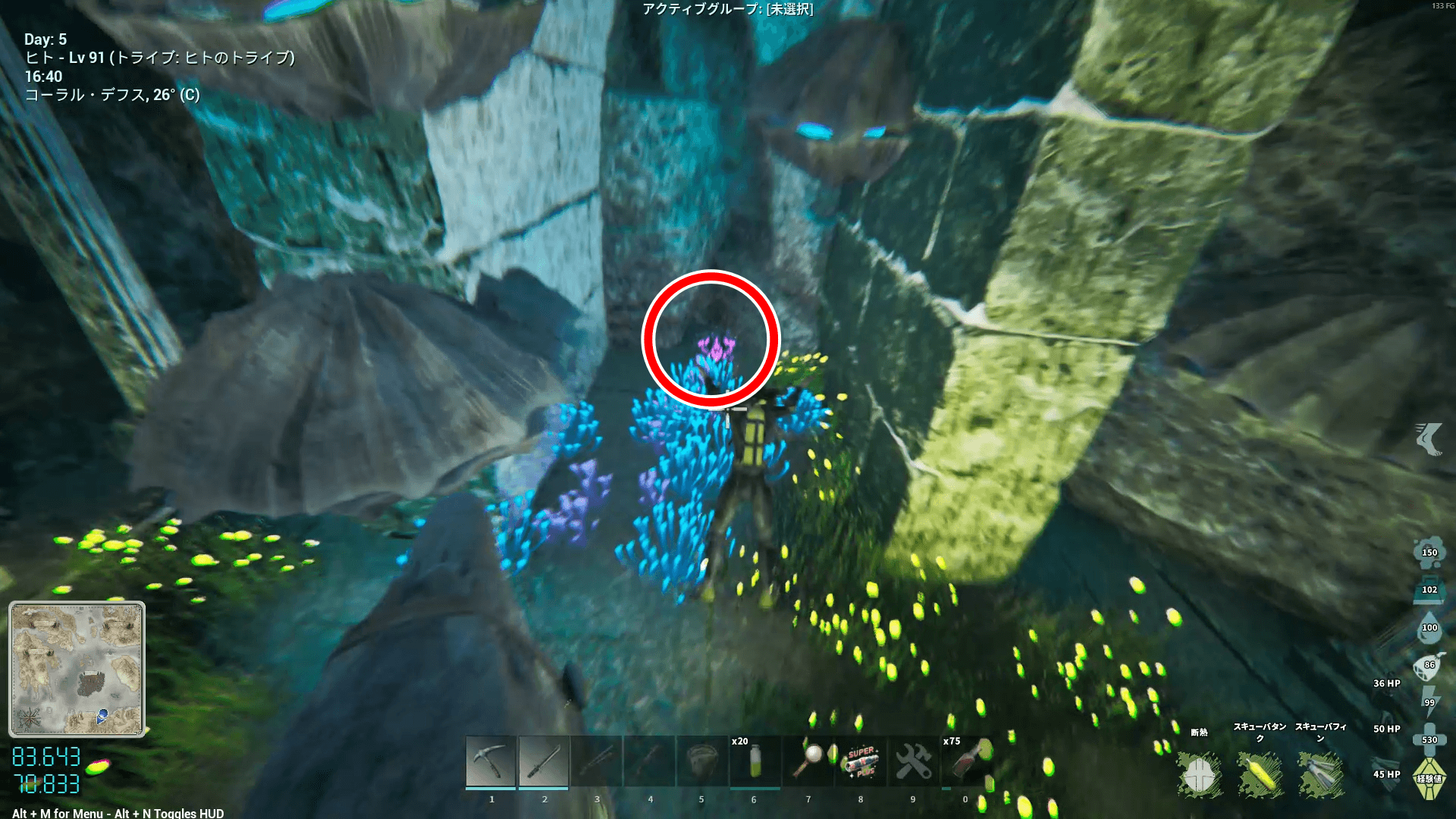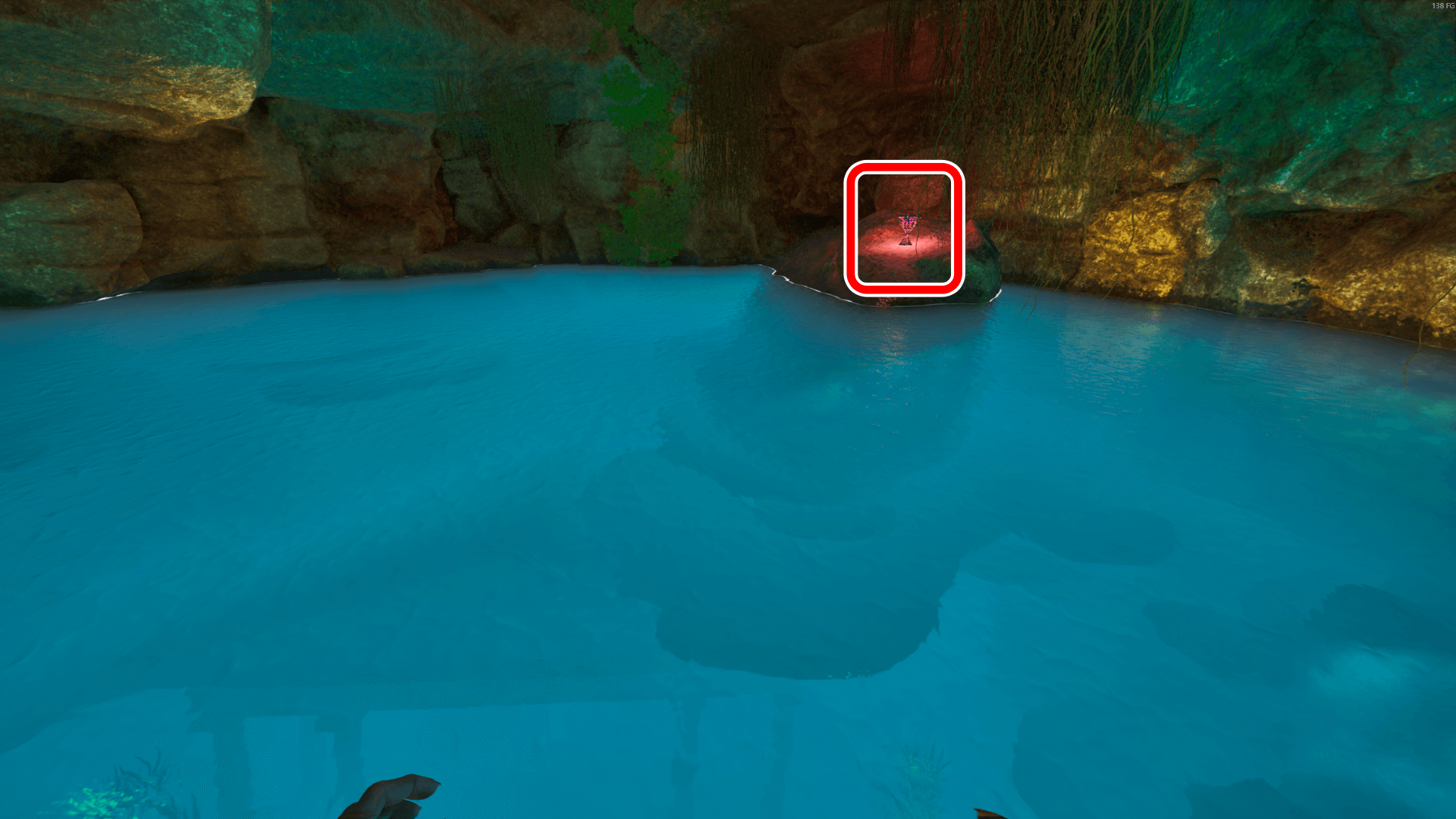 座標80.9/72.0付近にある海底の洞窟の入口に向かう。バシロは進入可能だが、モササウルスなどは進入不可。