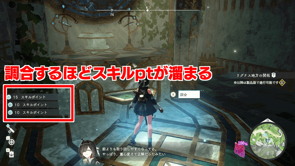 素材を集めたらアトリエへ帰り、調合で装備強化とスキルポイント稼ぎを行おう。調合1回につき10〜15ptのスキルポイントが貰えるため、中間素材作成→装備作成を繰り返すだけでスキルポイントが溜まる。特に序盤はこまめな調合が育成のカギになるため、戦闘よりも調合重視で進めよう。