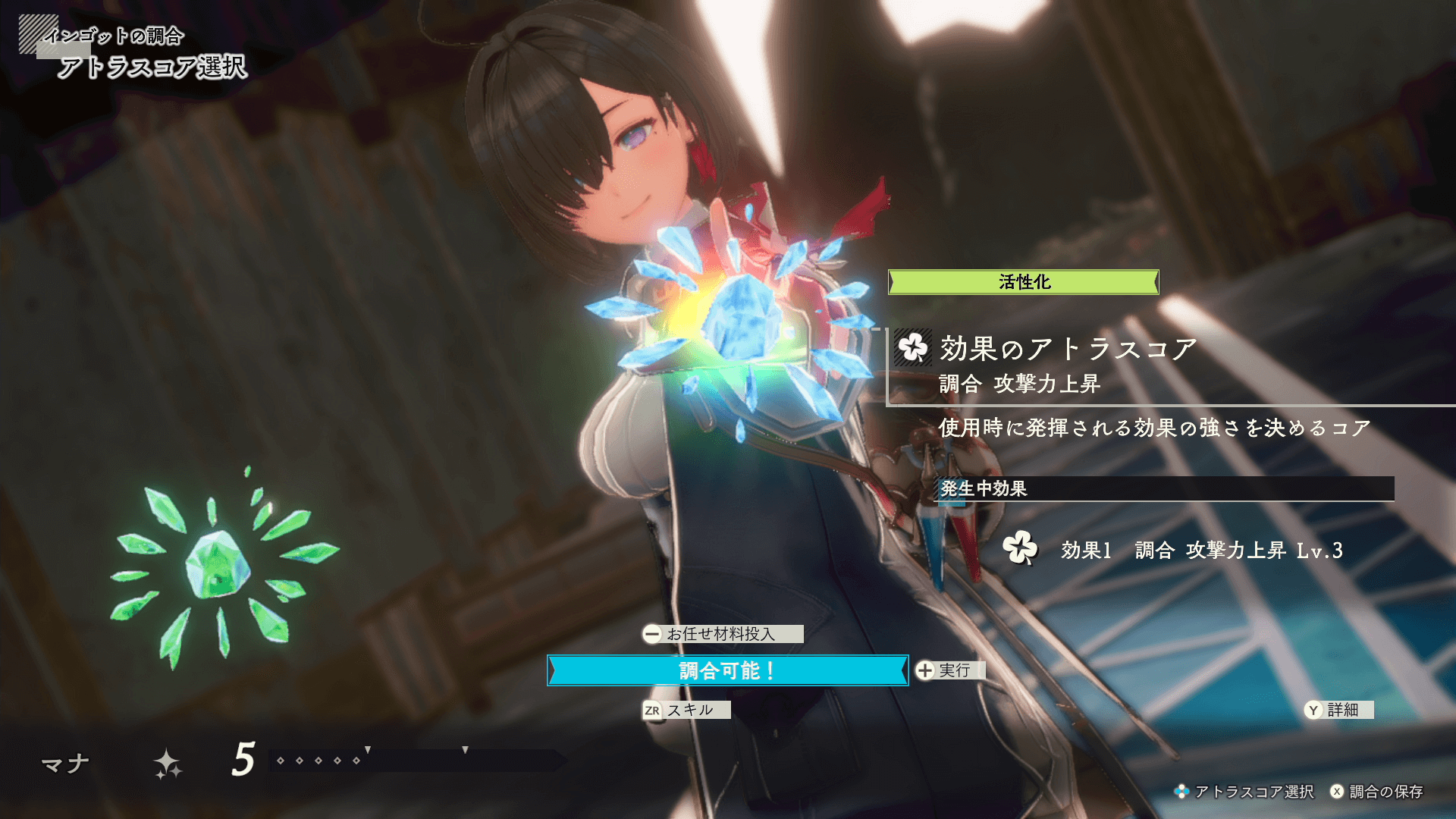 | アトリエでこまめに調合を行う装備の強化とスキルpt稼ぎの両面で育成が進む |