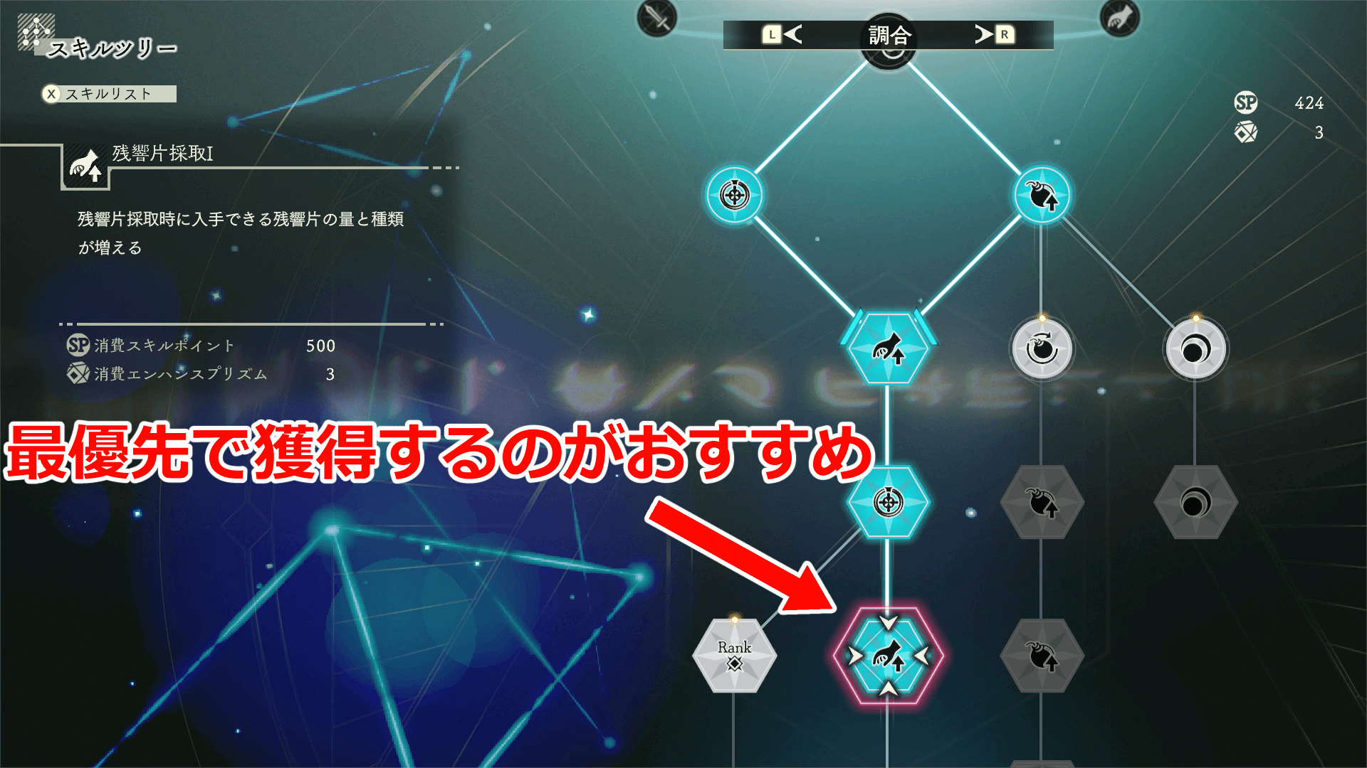 残響片は、スキルツリーの「残響片採集」を獲得すると大量に集めやすくなる。特に中盤から必要になる残響片中~大も入手できるようになるので、真っ先に獲得しておきたいスキルだ。