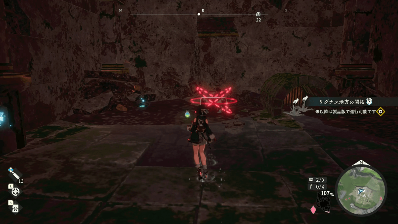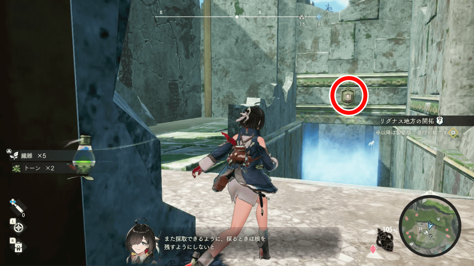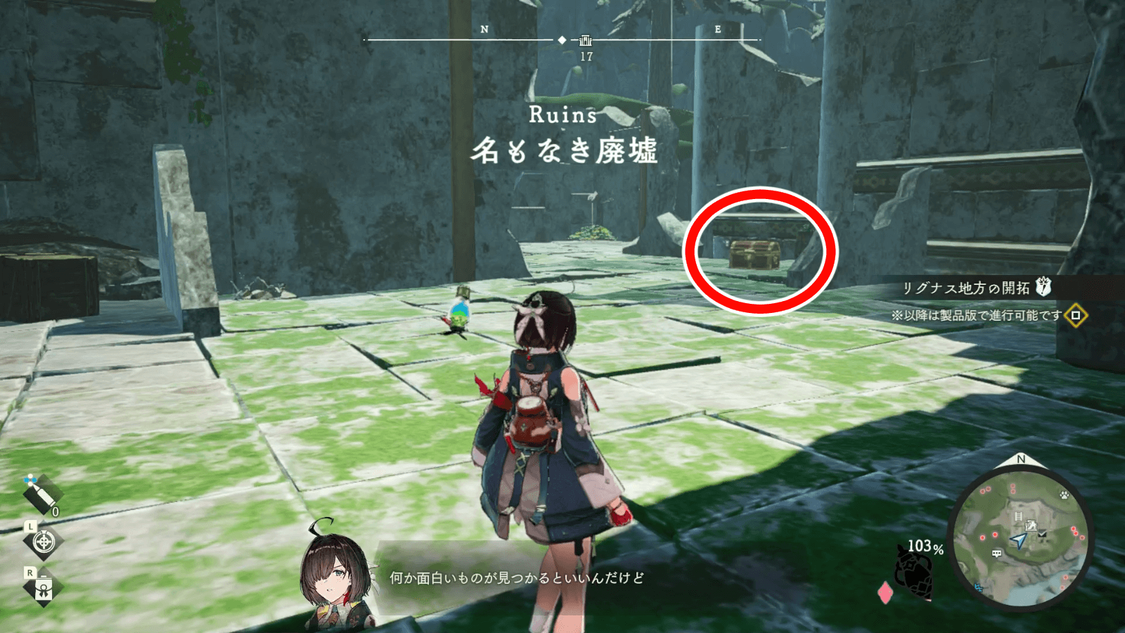 名もなき廃墟は、リグナス調査拠点から北東側に進むとたどり着ける。敵も出現せず安全に探索できるため、最初の遺構として最適の場所だ。