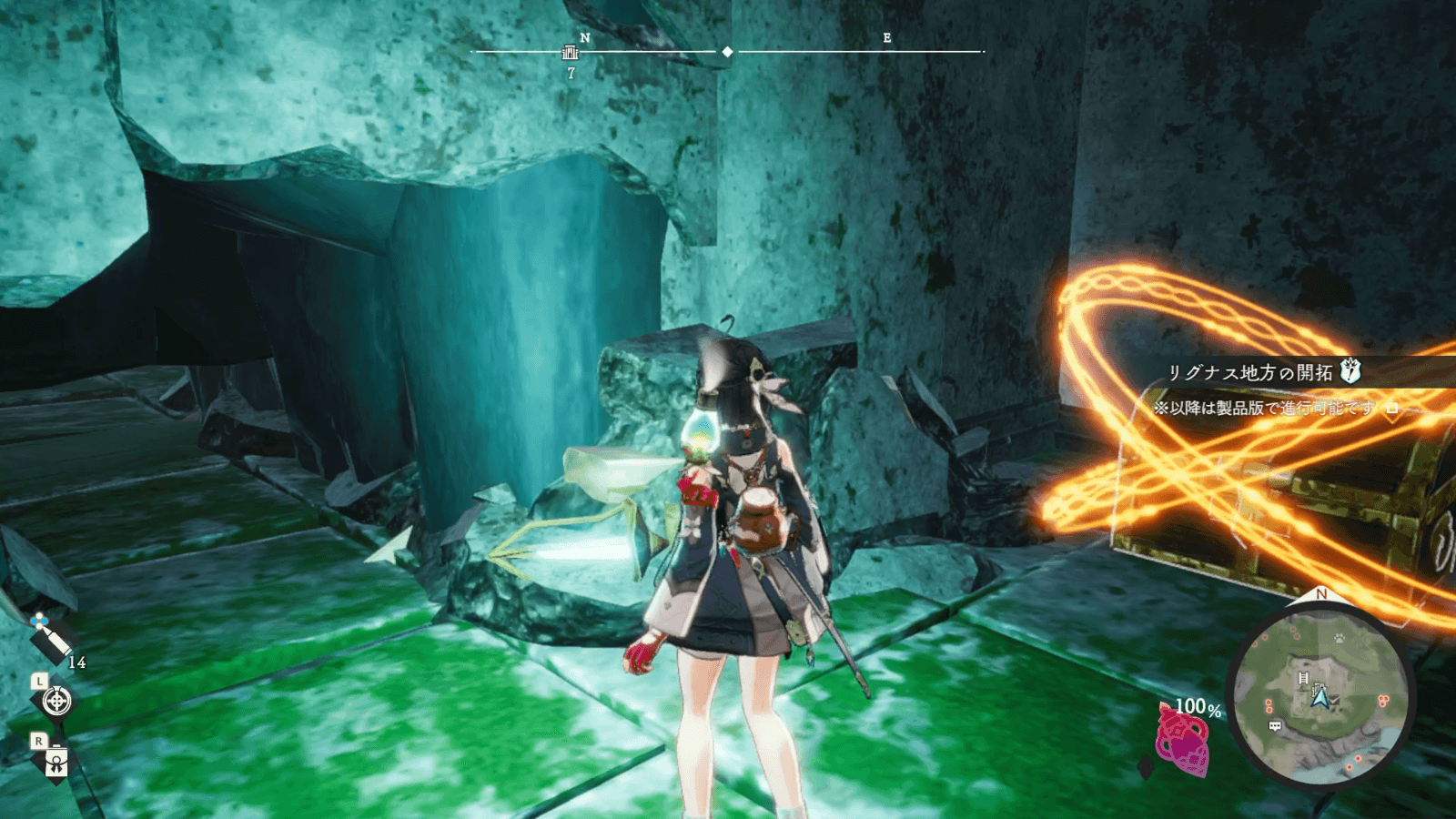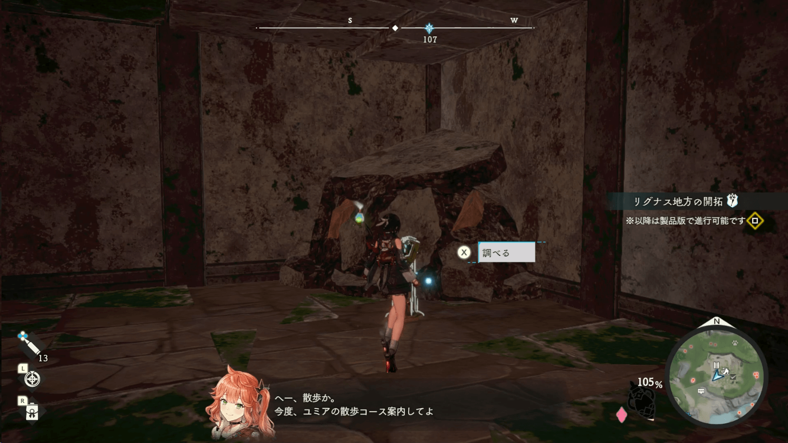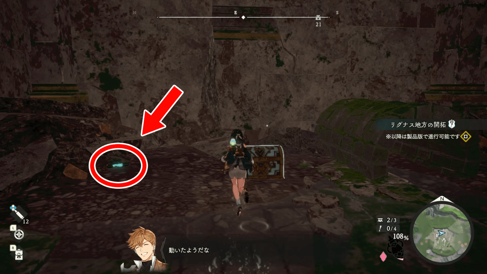 名もなき廃墟は、リグナス調査拠点から北東側に進むとたどり着ける。敵も出現せず安全に探索できるため、最初の遺構として最適の場所だ。