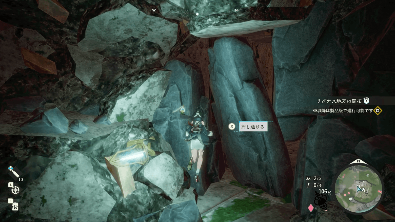 扉の反対方向に岩があるので、近寄って押しのけよう。押しのけると高台になっているため、そのまま進んで落ちないように気をつけると良い。