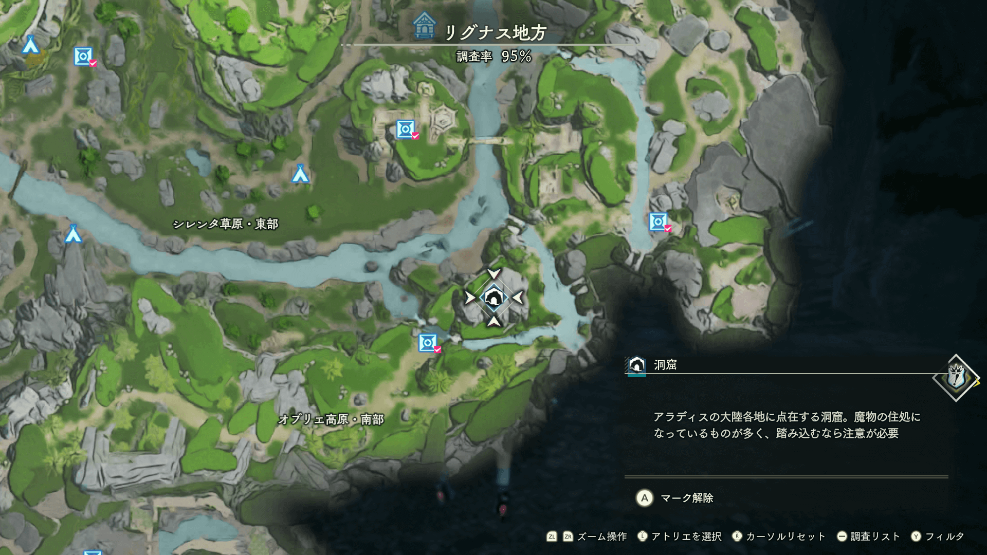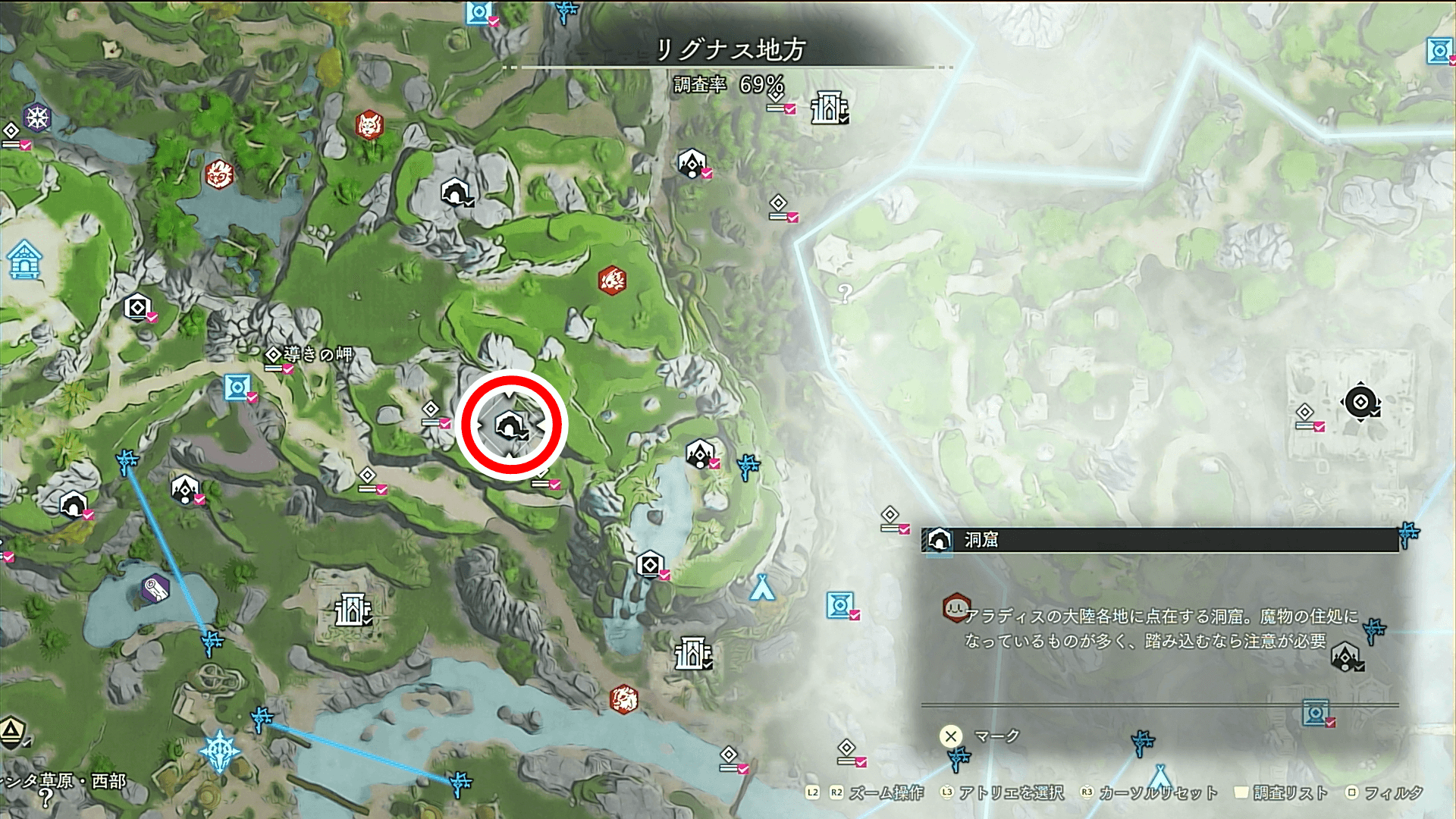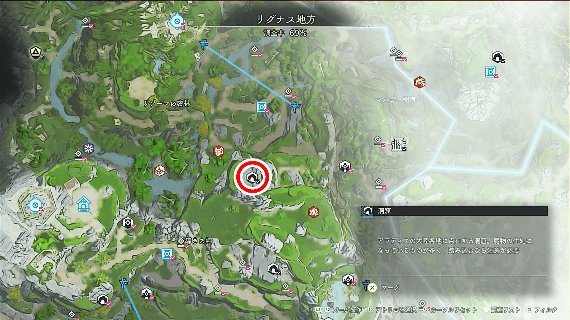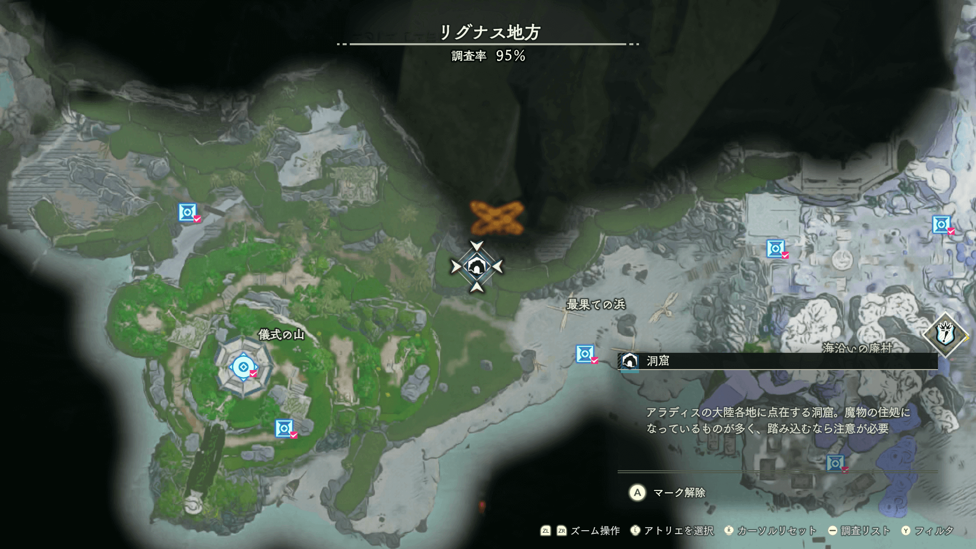 洞窟とは、各地に点在する封印された宝箱が設置された場所だ。洞窟内で入手できる宝箱からは、品質の高い素材などが手に入る。なお、未発見の状態の洞窟は、マップ上に「?」として表示されるため、洞窟を探したい時はマップの「?」アイコンを巡ると良い。