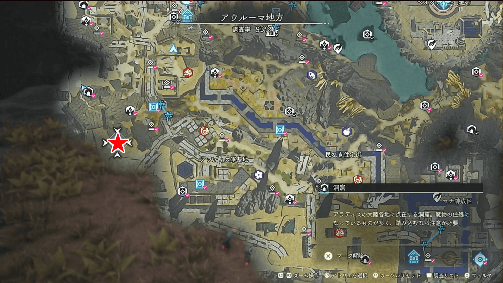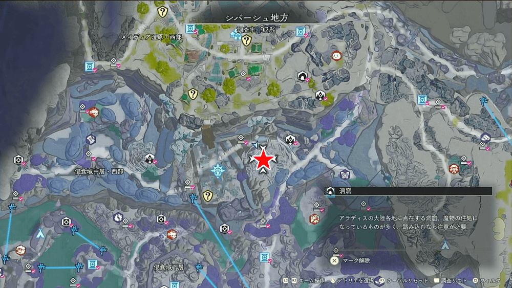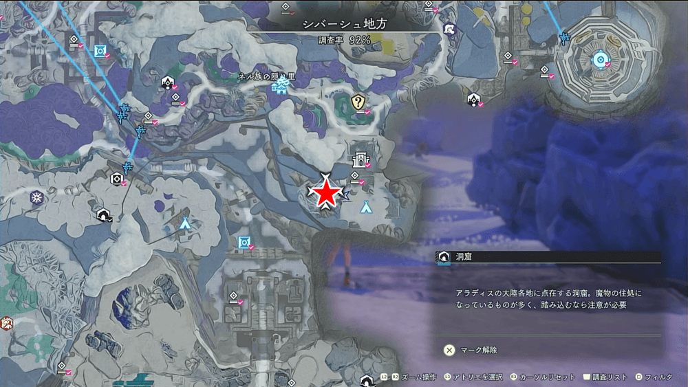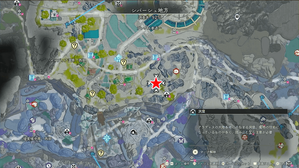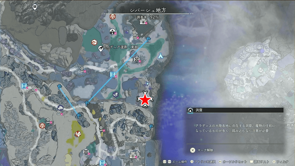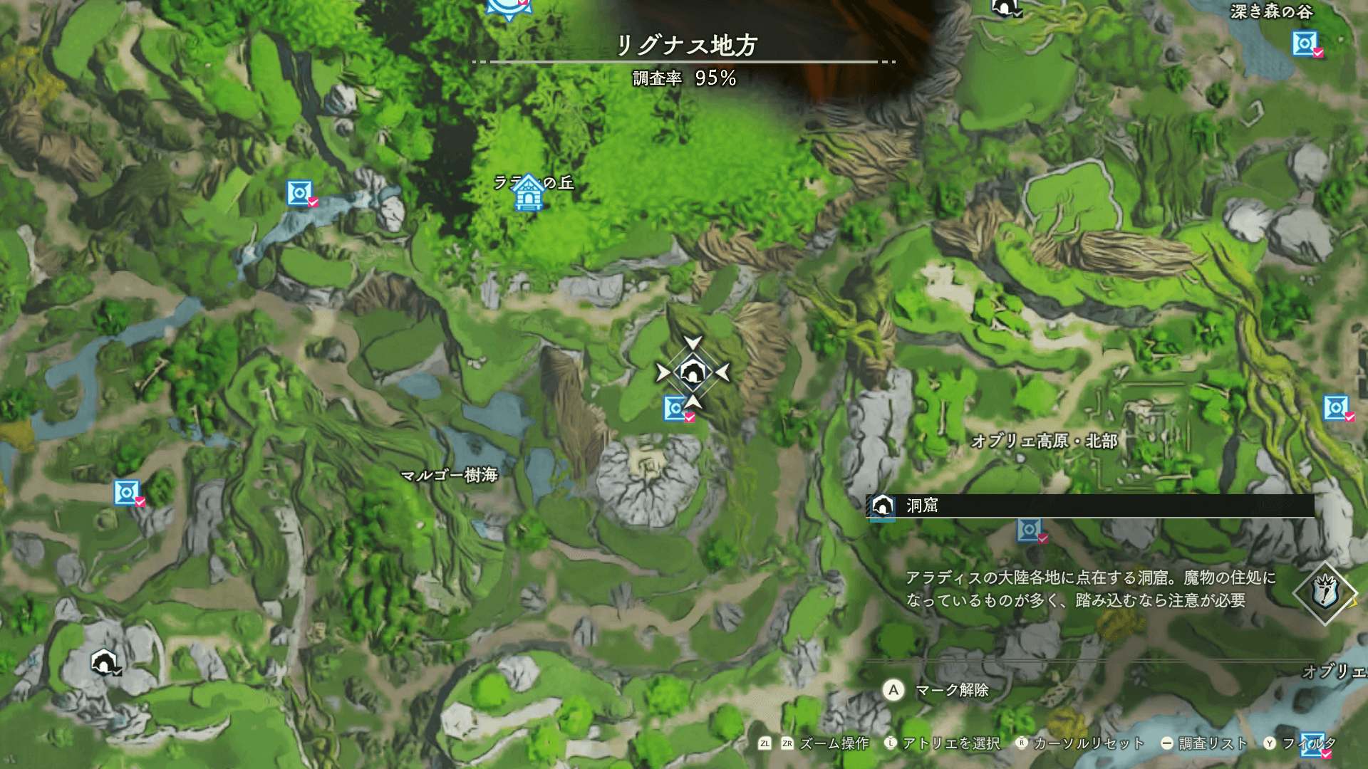 洞窟とは、各地に点在する封印された宝箱が設置された場所だ。洞窟内で入手できる宝箱からは、品質の高い素材などが手に入る。なお、未発見の状態の洞窟は、マップ上に「?」として表示されるため、洞窟を探したい時はマップの「?」アイコンを巡ると良い。