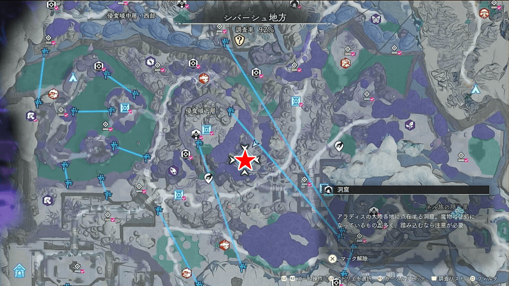 洞窟を攻略すると、地図の洞窟アイコンに赤いチェックマークがつく。攻略済みかどうか一目で分かる仕様となっているため、攻略を後回しにしてもいつでも後から確認できる。