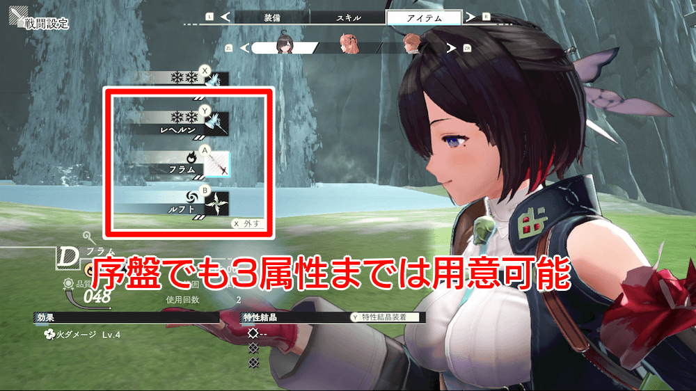 | 複数の属性アイテムを用意する全キャラ1属性ずつ所持が望ましい |