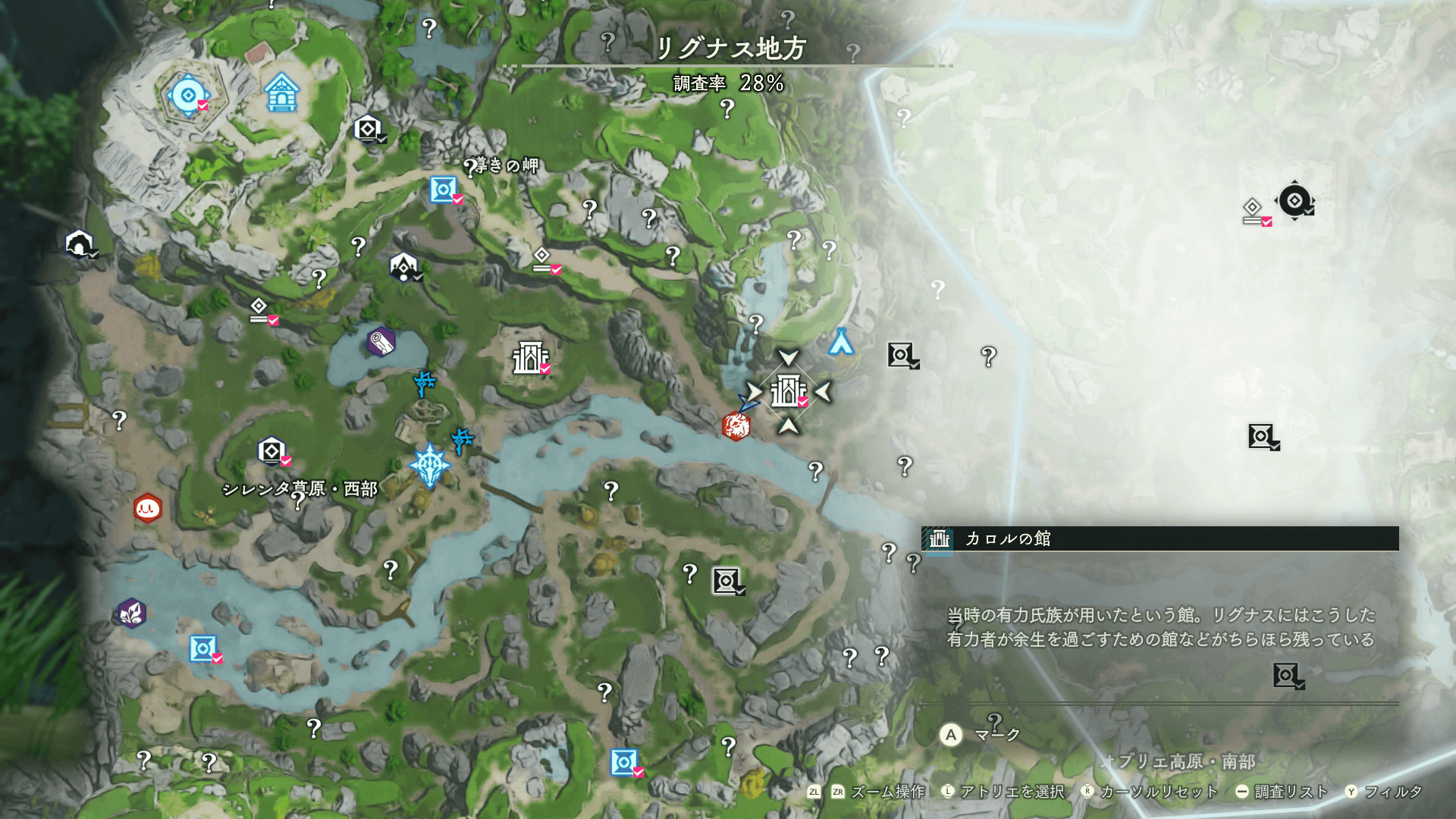 カロルの館は、リグナス調査拠点から東側の川沿いを進むとたどりつける。途中で名もなき廃墟の前を通るので、ついでに探索しておくのがおすすめだ。