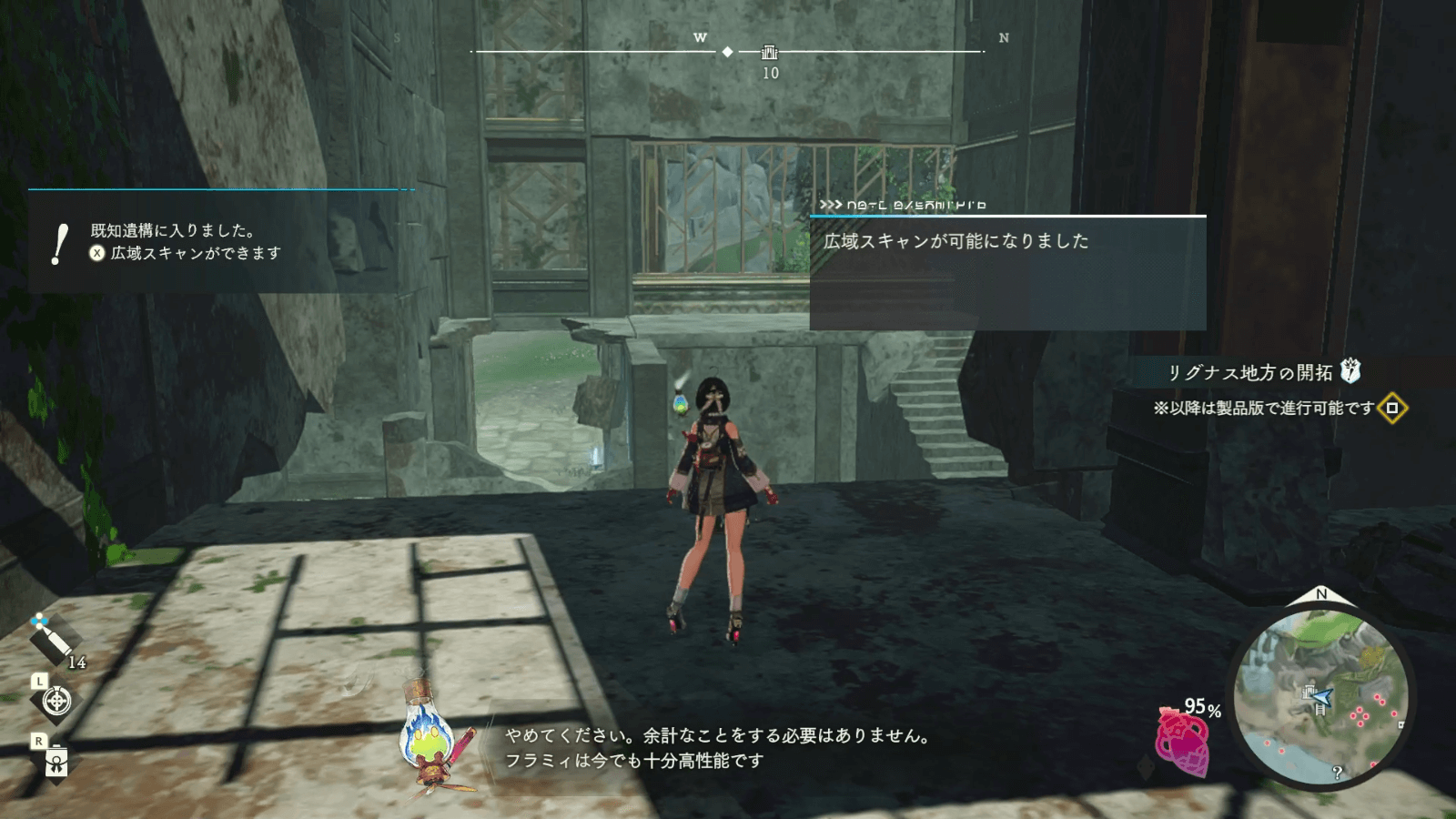 高台から落ちると目の前に広域スキャン用の端末があるため、広域スキャンを解放しておこう。広域スキャンを解放すると、家具作りに必要な遺宝の回収や、ミニマップに宝箱の場所が表示される。