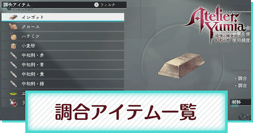 ユミアのアトリエの「調合アイテム」について解説。調合アイテムの効果を一覧で掲載中。調合アイテムユミアのアトリエを探す際の参考にしてください。