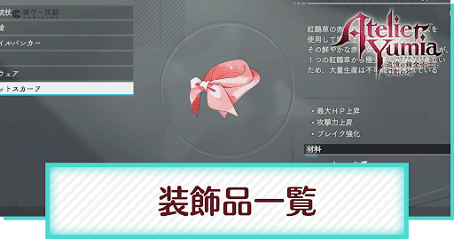 【ユミアのアトリエ】装飾品一覧 編集者 ユミアのアトリエ攻略班 最終更新日 2025/04/14 12:18 ユミアのアトリエの「装飾品」について解説。装飾品の効果を一覧で掲載中。装飾品ユミアのアトリエを探す際の参考にしてください。 目次 装飾品一覧 ユミアのアトリエの装備品 装飾品一覧 サペンシアアニュラス装飾品--◯ - 効果スキルダメージ増加アイテムダメージ増加アイテムCT短縮解放精霊の花衣 釣鐘草 スカーレットスカーフ装飾品◯-- - 効果最大HP上昇攻撃力上昇ブレイク強化解放紅鶴草 浮竜の羽毛 グレイスリボン装飾品-◯- - 効果素早さ上昇-効果耐性上昇ダメージ軽減解放ヨルノキフジン はねとばり カーススポイラー装飾品--- ◯ 効果スキルダメージ増加スキルCT短縮ダメージ還元解放ジニアストンリング プラジオライト 闘志のバングル装飾品◯-- - 効果戦闘不能回避闘争心アドレナリンラッシュ解放カットラス コングの堅甲 エターナルフラワー装飾品-◯- - 効果最大HP上昇枯れない花輪満開の花園解放ダークカーネーション 永久機関 祈念の指輪装飾品--◯ - 効果フェザーブーツライトヴェール聖者の祈り解放フルメタルグレープ コーラルチップ 軍師のチョーカー装飾品--- ◯ 効果奇襲作戦合戦戦術兵站補充解放ハーモニックサンド プロテクタイト 道化師の仮面装飾品◯◯- - 効果トリックスタージャックインザボックス忍び足解放ニュイラーハ ピュアトリフ アナザーメモリー装飾品--◯ ◯ 効果限界突破逆境境セカンドチャンス解放ローズクリスタル 結晶うに 訓練用ヘビーバンド装飾品◯-- - 効果攻撃力上昇最大HP上昇経験値増加解放早期購入特典 ユミアのアトリエの装備品 装備品一覧 武器 防具 装飾品 最強装備ガイド 最強武器 最強防具 最強装飾品 最強アイテム 最強装備の作り方