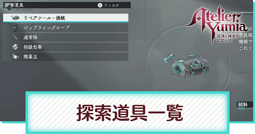 ユミアのアトリエの「探索道具」について解説。探索道具の効果を一覧で掲載中。探索道具ユミアのアトリエを探す際の参考にしてください。