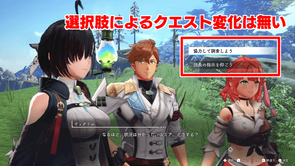イベント中に選択肢が出現するものの、ここの選択肢ではクエスト内容に変化は起きない。好きな方の選択肢を選んで先に進もう。
