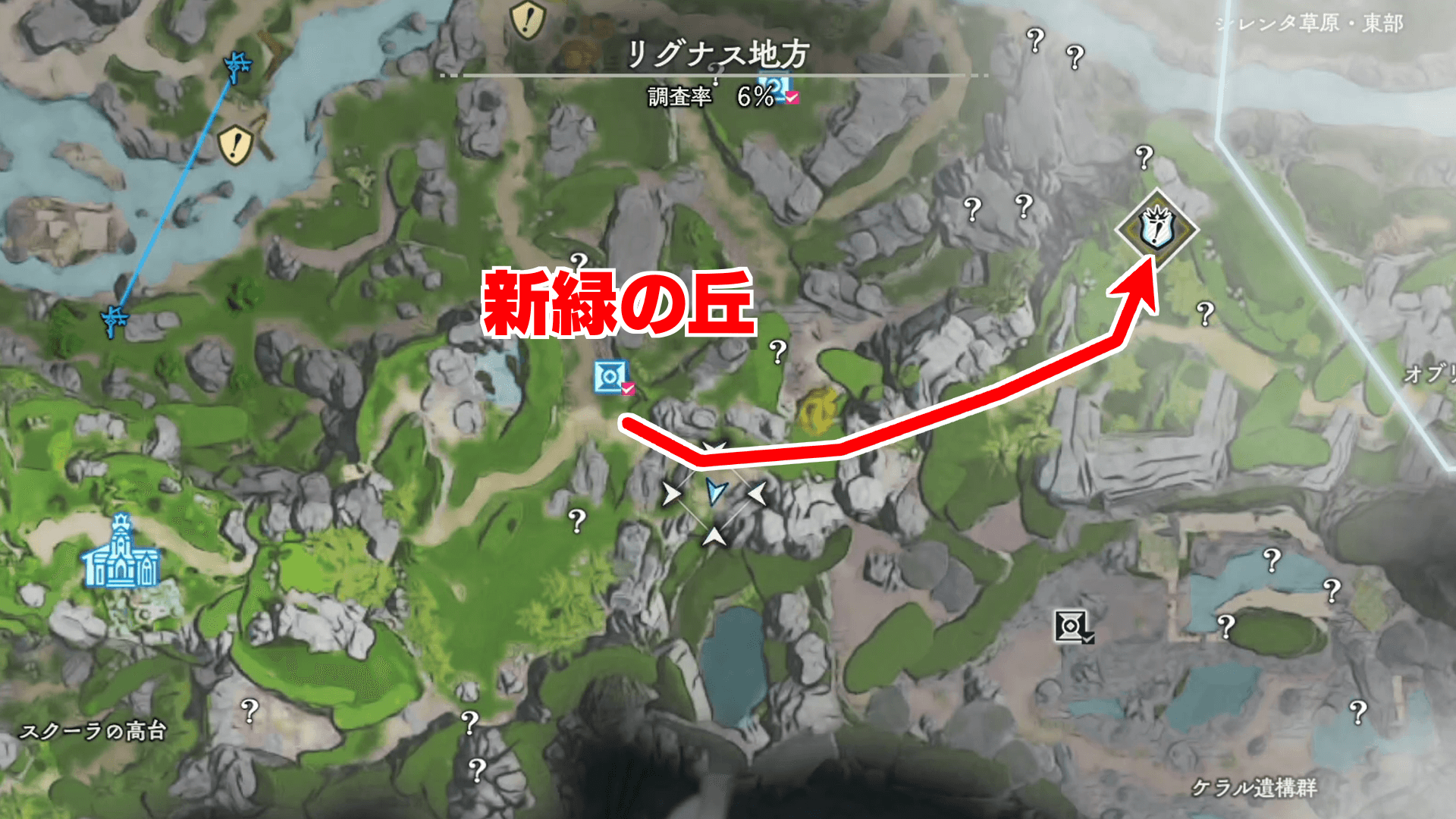 クエスト開始後はシレンタ草原東部付近の指定地に向かおう。事前にファストトラベル先が解禁しているなら、「新緑の丘」に移動し、そこから東に向かうと、目的地まで最短で行ける。