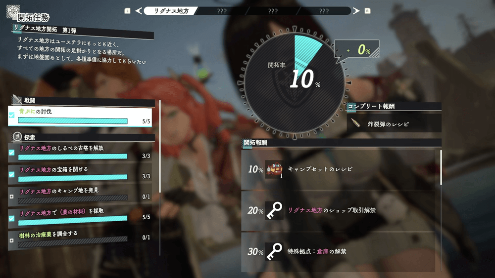 クエストが始まったら、地方内の開拓率を10%以上にしよう。戦闘/探索目標を達成していくと、開拓率が上がっていく。追加されたノーマルクエストを進めつつ、探索で目標達成を目指すのがおすすめだ。