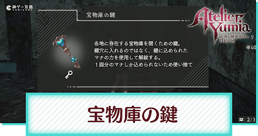 ユミアのアトリエの「宝物庫の鍵」について解説。宝物庫の鍵の場所や所持数の確認方法と使い道についても掲載中。宝物庫の鍵ユミアのアトリエで探索するときの参考にしてください。