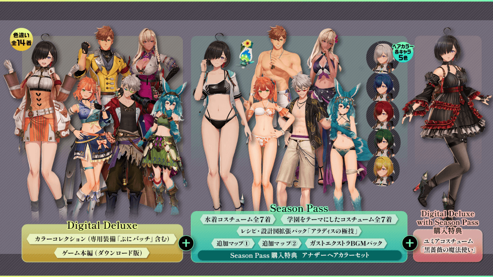 | ・Digital Deluxe同梱物 ・ユミアのアトリエシーズンパス(DLC) ・ユミアのアトリエ アナザーヘアカラーセット ┗各キャラクター5色ずつ(フラミィは炎を変更可) ・ |