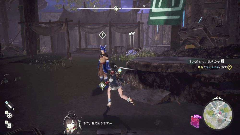 ネル族との小競り合いはウェルクスの村中央の依頼人から開始する。戦闘は発生しないクエストのため、補給や装備更新の必要はない。