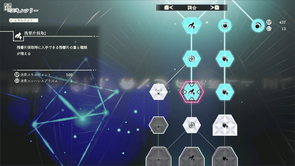 長距離移動中に大量の新素材や残響片を入手する機会があるため、スキルポイントがあるなら探索前に「残響片採取Ⅰ」や「採取等級Ⅰ」、「射撃精度Ⅰ」などを取得しておこう。以降は敵も強くなり、危険な戦闘も増えるため、このタイミングで集めた素材を使い、全員の装備を鍛え直すのがおすすめだ。
