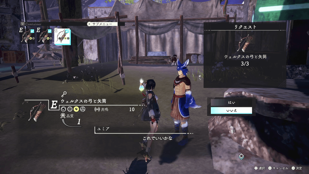 依頼を受けたら拠点に簡易祭壇を置くか、アトリエに戻り、ウェルクスの弓と矢筒のレシピを解禁して作成しよう。1回の作成で3個完成し、品質や効果は最低でも納品できる。最低限の性能で作成して渡しにいこう。