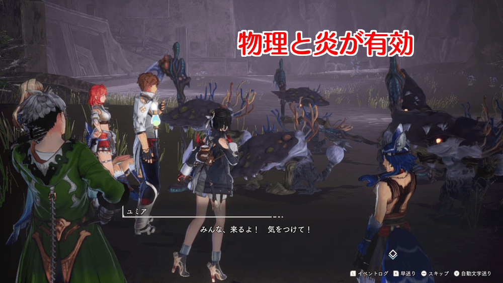 直前に加入したニーナは装備やアイテムが弱く、そのままでは戦力にならない。幸い、出てくる敵は物理ブレイク対象のため、ニーナを使う必要性は低い。後で大量の素材が集まるため、素材採集が終わってからニーナの装備を鍛えよう。