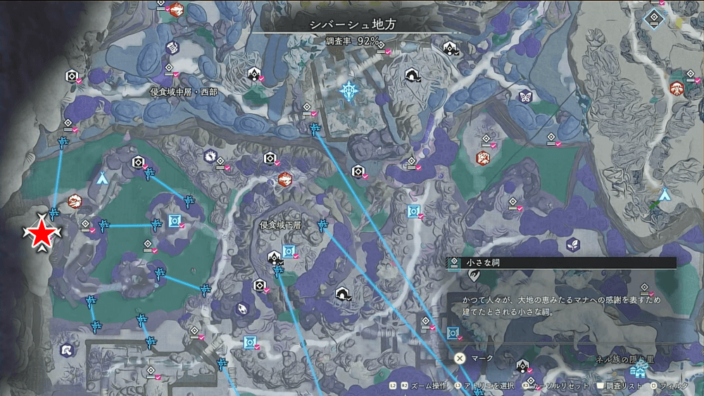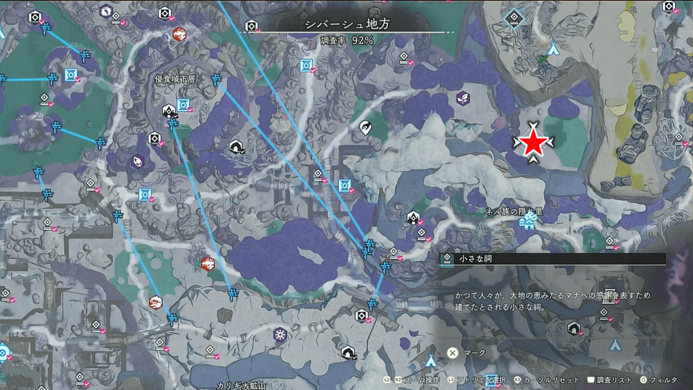 小さな祠を調べると、画面右下に表示されているエナジーが10%回復する。エナジー回復手段として用いるには控えめな回復量だが、長時間「高濃度マナ領域」の探索を行う際などには役に立つ。