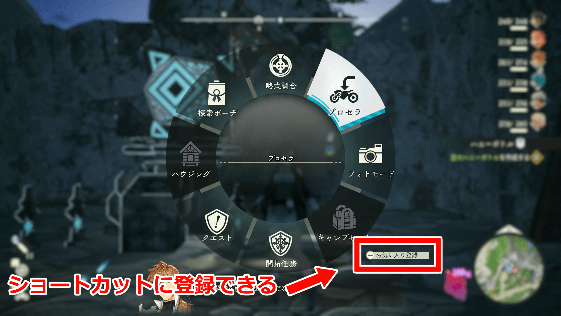 バイクはサークル型のメニューから選択できるが、お気に入り登録しておくのがおすすめだ。サークルメニューのまま使っているとカメラや略式調合を間違えて選びやすく、ストレスの要素が多い。