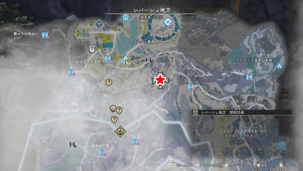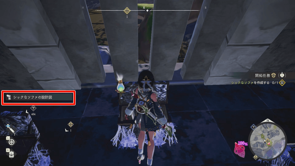 シックなソファの設計図は、シバーシュ地方のウェルクスの村から南東の宝物庫で入手できる。宝物庫を開けるのに「宝物庫の鍵」が必要になるので、各地の遺構などを探索して鍵を集めておこう。