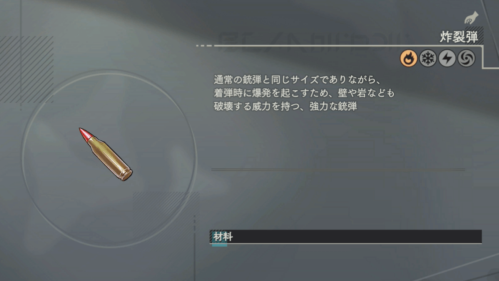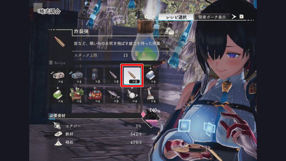硝石×3炸裂弾のレシピが解放できたら、略式調合からいつでも炸裂弾を作成できる。炸裂弾を作成するには、資材の「鉄材」「硝石」が必要になるため、関連する素材を採取して集めておこう。