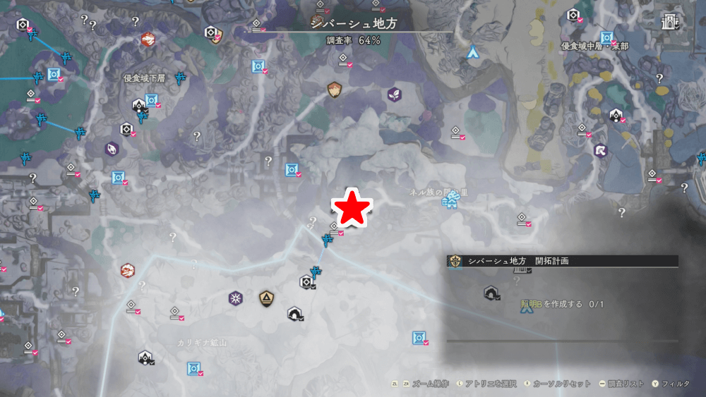照明Bの設計図は、シバーシュ地方のネル族の隠れ里から西の宝物庫で入手できる。宝物庫を開けるのに「宝物庫の鍵」が必要になるので、各地の遺構などを探索して鍵を集めておこう。
