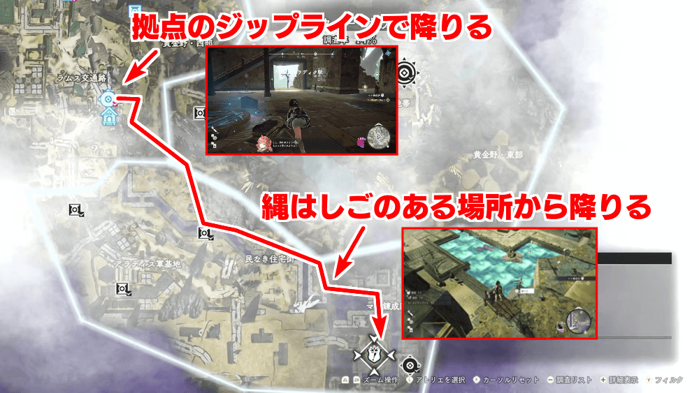 クエストが開始したら、ラムスラディク駅のランドマークから南東に進み、マナ錬成炉へ向かおう。「住宅街十字路」のファストトラベルを解放したら東へ進み、縄はしごがかけられる地点から降りていけば、ダメージを受けずにマナ錬成炉に辿り着く。