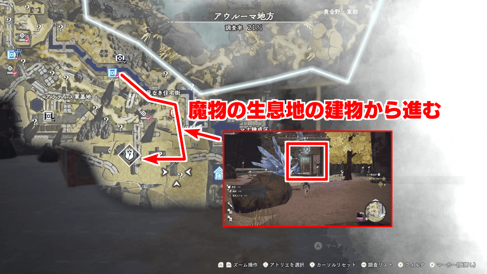 目的地が地下洞になったら「住宅街十字路」にファストトラベルし、南東の建物から地下洞へ入ってスティリウムを回収しよう。周囲にはウォーロードの生息地があるため、生息地マークを目印にして進むと良い。