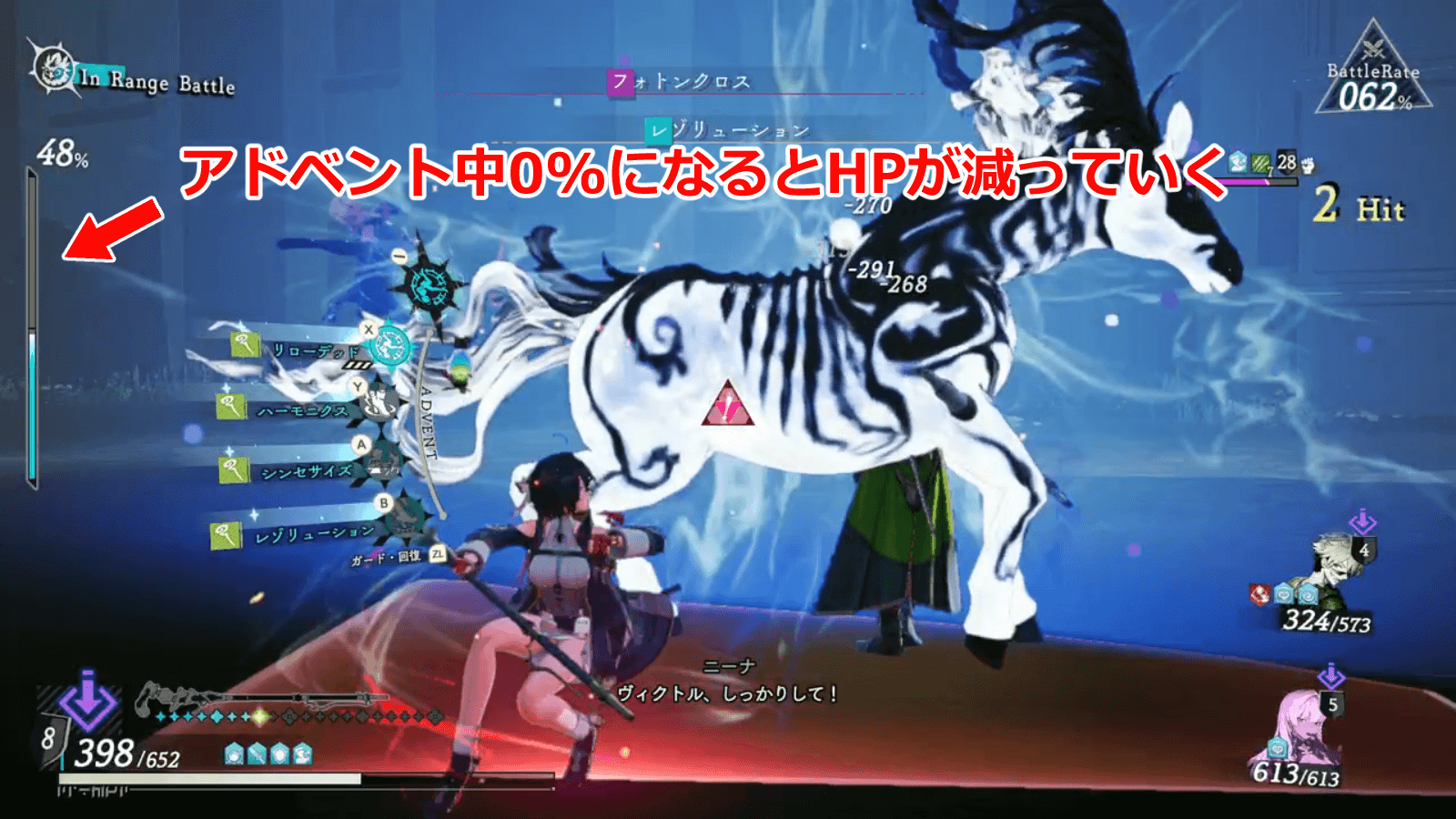 アドベント中に倒されると、戦闘不能回復を使っても復活はできない。HPが少ない場合は環境マナの残量に気をつけつつ、敵の強力な技に合わせて必殺技を使ってアドベントを解除しよう。
