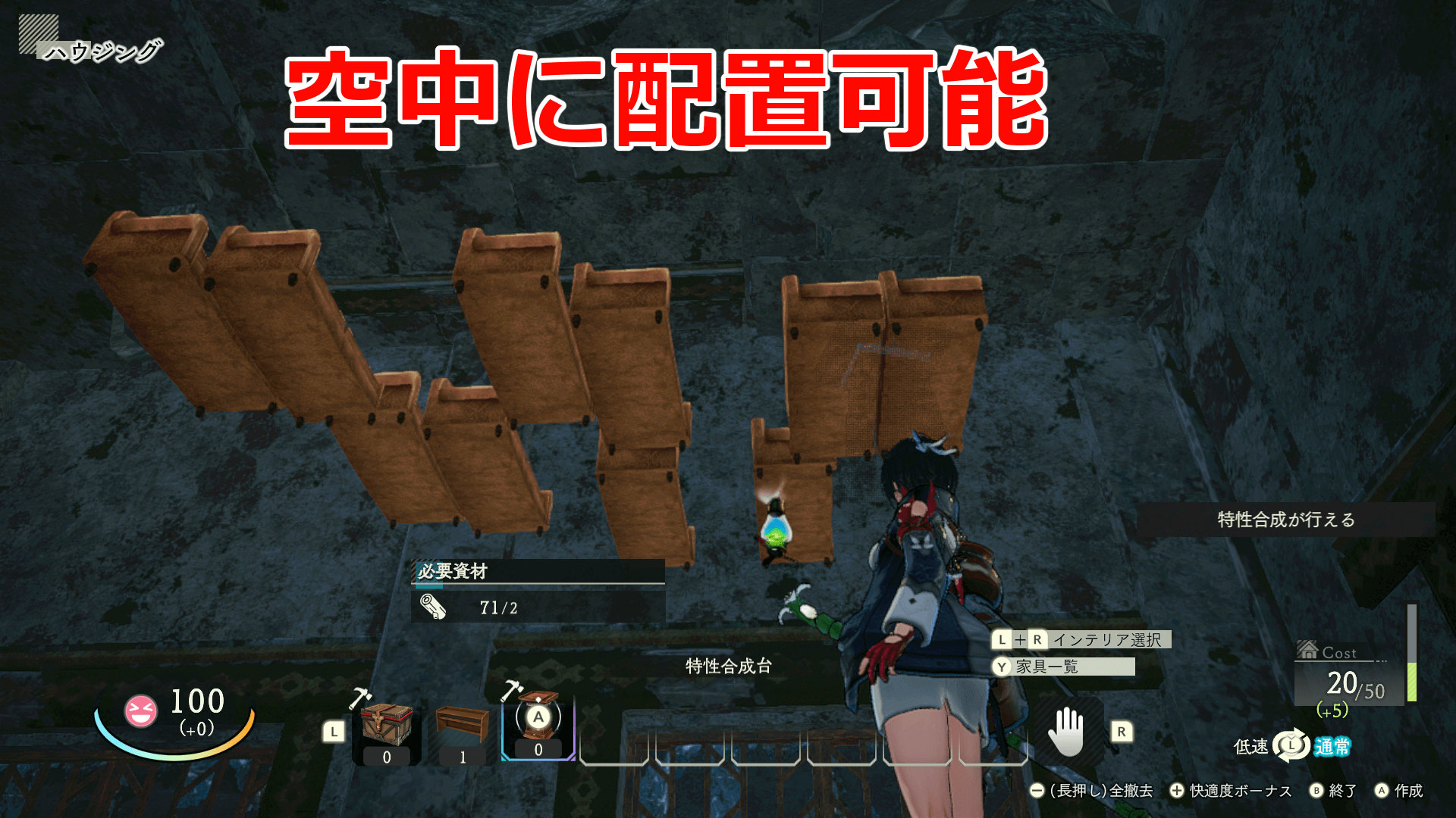 雑多に家具を並べるだけだと見た目が気になる場合は、空中や壁を設置して家具を隠せる。また、見た目に拘って家具を配置して、足りない快適度を補うためにソファを置いても良い。