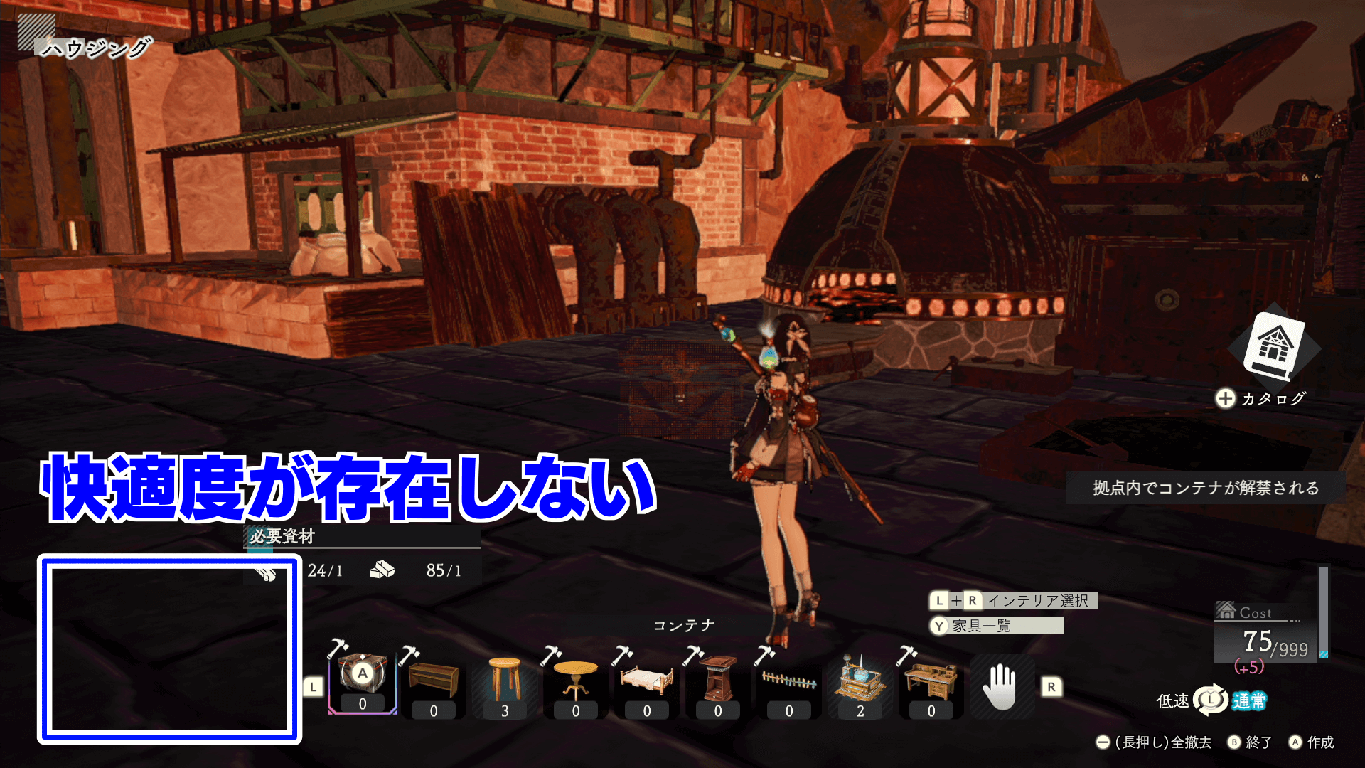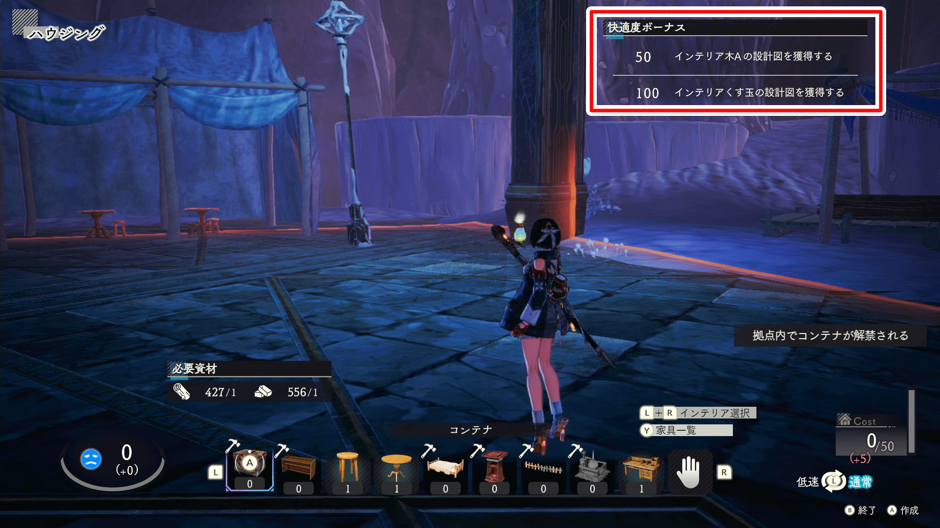 一度快適度ボーナスをもらえば、快適度は下げても問題ない。もらったレシピやボーナスは問題なく使えるため、雑多に置いたインテリアが邪魔なら収納しよう。