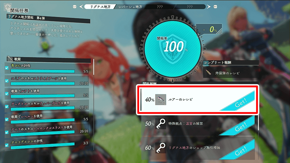 リグナス地方の開拓率を40%まで上げると「ルアーのレシピ」が入手でき、釣りができるようになる。その先の開拓率50%で、アイテム複製に使える有用な特殊拠点「温室」が入手できるため、開拓任務が解放されたらすぐに回収しておくのがおすすめだ。